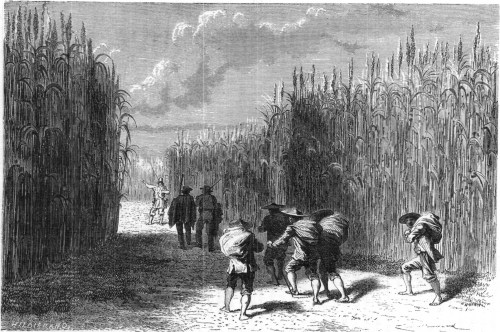 The footing was level and easy. Rocks and precipices were left behind, and were displaced by a soft, slippery sort of sand, where from space to space were planted, like so many oases in a desert, clumps of giant reeds. By a strange but natural caprice these beds of rustling verdure were cut in an infinity of well-defined geometric forms. Seen from an eminence and at a distance, this arrangement gave a singular effect. In the midst of these native garden-beds were cut distinct and narrow alleys, where the drifting sands were packed like artificial paths. It is unnecessary to add that the soft footways, notwithstanding their advertisement of verdure and shade, proved to be of African temperature.