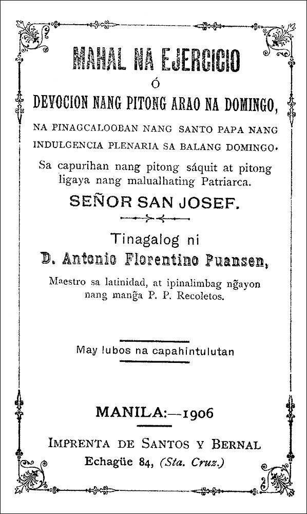 Manila I.º de Octubre de 1874. Por las presentes y por lo que á Nos toca, concedemos la licencia necesaria, para que pueda imprimirse el manuscrito tagalo titulado Mahal na, Ejercicio, ó Devocion nang pitong arao na Domingo: en atencion á que de nuestra órden ha sido examinado, y segun la censura no contiene cosa alguna contra el dogma y la moral, y que será muy útil, para promover la devocion al Señor San Josef. Librese por Secretaría testimonio de este decreto, y archívese original.—Gregorio, Arzobispo.—Por mandado de S. E. I el Arzobispo mi Señor.—Luis Remedios.