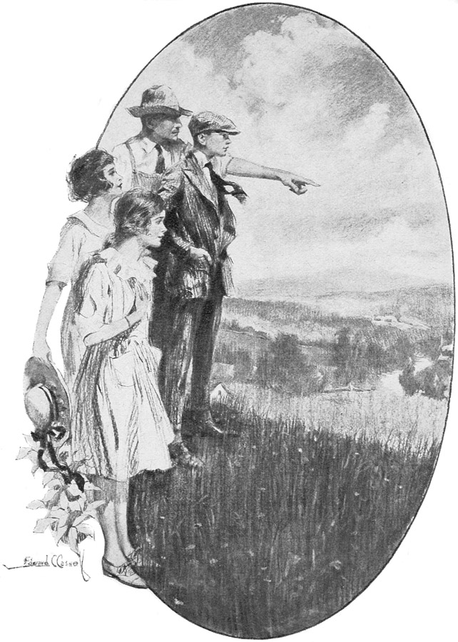 Janet climbed over to the place beside her brother, and the tonneau filled up with men, who crowded the seats, clung to the step and the fenders, and sat in a row across the back of the car. They came to the end of the road at last where, in that place that had been so empty and quiet half an hour ago, there was [199]now gathered a surging crowd of men, of horses, tractors, automobiles, and wagons. Oliver could see, on a knoll above the others, Polly standing with two farmers' wives, the only women there.