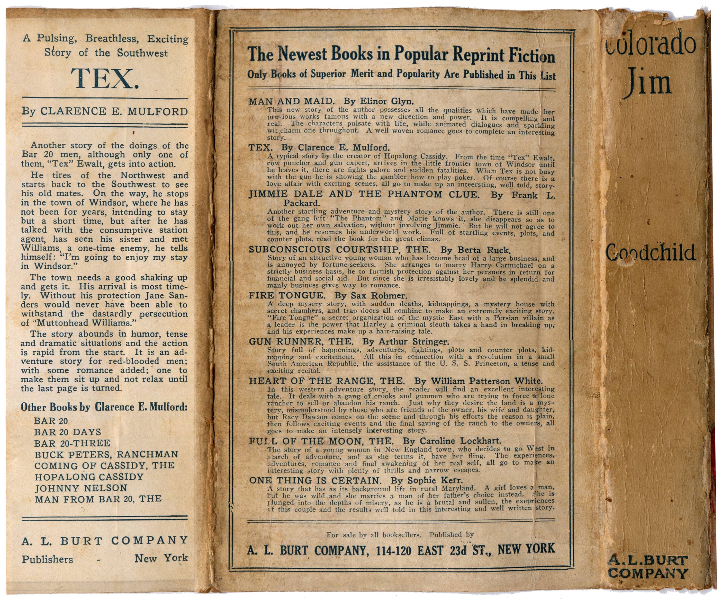 Thorough in all things, he had packed his bags overnight, leaving but a few necessities such as razor and tooth-brush (recent acquisitions) to complete. He left the window now with a curious sigh, and gave a last pull on the strap of the largest bag with his big, muscular hands. Even now, with the ramshackle stage-coach almost at the door, he could not bring himself to believe that the old life was over and done with. What the devil was he up to, anyway, hiking around in creased trousers and black boots? Colorado Jim bound for Europe—London! It sounded impossibly fantastic. But there it was, written on the labels of his bags—“James Conlan, London, via New York.” He tucked the rebellious collars of his soft blue shirt into his waistcoat, and pulled out an enormous watch.