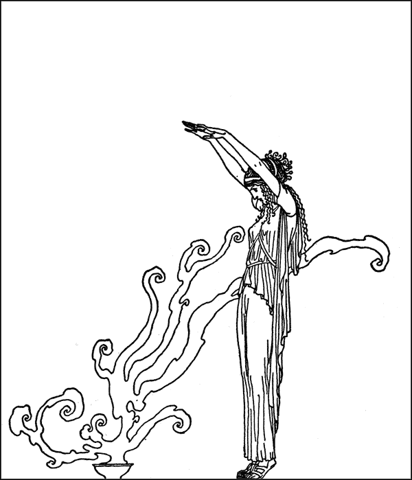 In triumph she went through the city. But as she was passing the temple her dress was caught and held, and turning around she faced the ancient priestess of Artemis, Iphias. “Thou art Æetes’s daughter,” Iphias said, “who in deceit didst come into Iolcus. Woe to thee and woe to Jason for what thou hast done this day! Not for the slaying of Pelias art thou blameworthy, but for the misery that thou hast brought upon his daughters by bringing them into the guilt of the slaying. Go from the city, daughter of King Æetes; never, never wilt thou come back into it.”