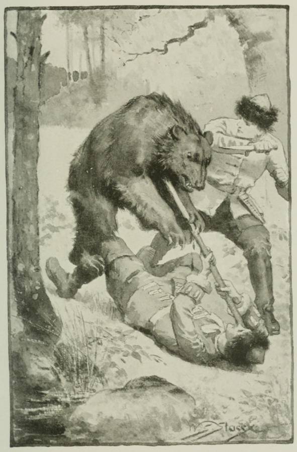 And now his head began to swim, and his eyes grew hot and dimmed, and there was a sound in his ears as of waters that rushed in and overwhelmed him. Still his senses did not desert him, nor his nerve. As he became conscious that his strength was failing him he became the more determined to hold out, and with a hoarse shout of defiance he pulled himself together for one supreme effort. His failing grasp clutched tighter at the shaft; his stiff and aching feet planted themselves yet more firmly in their grip of the foothold from which they had not budged by a hair's-breadth; his tightened muscles tightened themselves yet more as he bore upon the shaft, and forced it by sheer strength of will a couple of inches further towards victory. The bear tottered, his eyes rolled and his tongue showed between his teeth, and for a moment it seemed that Boris had[20] won the battle. Now it is anybody's game! For an instant and another neither bear nor man has the advantage. Then the bear rallies. Growling, sputtering, roaring, the monster slowly recovers his lost ground, then gains an inch, and another. Boris feels faint and dizzy; his strength is failing, his grasp relaxing. Still he fights on; but it is useless now. His brave feet, that have held their own so long, give way; his muscles too, they have made a good fight, but they cannot hold out longer—they are relaxing; his fingers are loosening their hold upon the shaft; his eyes are so dim now that they cannot see the monster who is falling upon him to slay him; he is vanquished, he is giving ground rapidly; in another instant he will fall, and die. The bear will die too, of course; that thought will be his dying consolation.