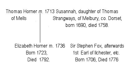 [174]  In text the genealogy is: Thomas Horner of Mells m. 1713 Susannah, daughter of Thomas Strangeways, of Melbury, co. Dorset, born 1690, died 1758: they had issue Elizabeth Horner (born 1723, died 1792).