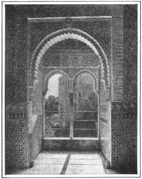 It is not such a step as it may seem from the Taj Mahal to the Alhambra (al-ham'-bra). Both are oriental. Both are the products of Mohammedan art, and mark in a way its Eastern and its Western expressions. As early as the eighth century of our era the Moors of northern Africa crossed to Spain and made the Iberian peninsula a Moorish califate or kingdom. Its capital and last stronghold was Granada. And here on a lofty hill, overlooking the city, King or Calif Al Hamar began the mighty fortress of the Alhambra in the early years of the thirteenth century.