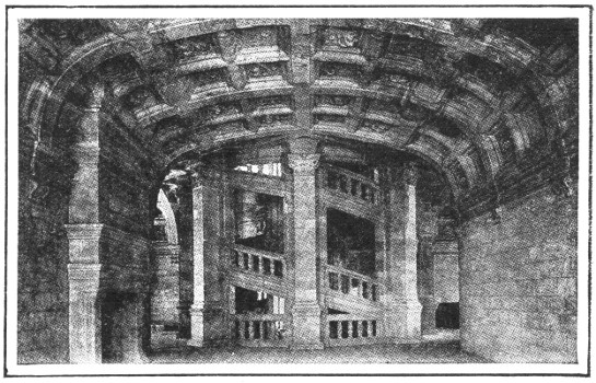 Few if any buildings in the world have been the subject of such praise as that bestowed upon the Taj Mahal ("Gem of Buildings"). Travelers,[2] painters, authors, and poets have all sought to express in word or color the indefinable charm of this gem of Indian art. Built at Agra, in India, by the great mogul of Delhi, Shah Jahan, as a tomb for his favorite wife, Mumtaz Mahal, the Taj is a veritable translation into stone of human remembrance and affection. It was begun in 1632, and was completed in twenty-two years. The material of which it is built is pure white marble, and inlaid in its walls are jaspers, agates, and other stones in marvelous designs. But it is perhaps the dome that gives the greatest beauty to this tomb. Of typical Eastern shape, it rises a mass of white against the deep blue of the Indian sky, or shines like silver in the radiance of the Indian moon.