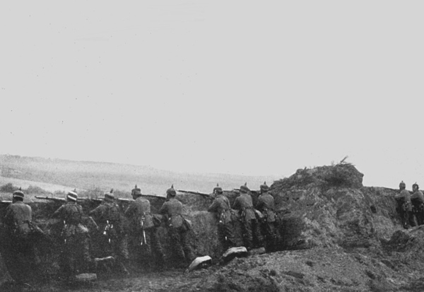 One learns to adapt one’s self even to quick-firing guns and incredible rifle-ranges. It has been mathematically demonstrated that, with the rifles now in the hands of the German infantry, a bullet fired from a distance of three hundred yards will pass right through five men standing closely one behind the other and lodge in the body of the sixth. But men in battle line no longer stand closely one behind the other, nor even closely side [Pg 35] by side. Even in what is considered a thick firing line they stand about three feet apart.
