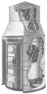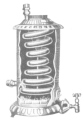 Efficient gas burning water heater with black sheet steel casing. Water runs through double copper coil and is heated by large burner shown at bottom. Conical shape of coil provides maximum heating efficiency. Suitable for heating 30 gallon range boiler. See Home Equipment Book for larger heaters.