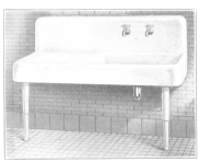 An attractive sink, massive in construction, cast in one solid piece from best grade of gray iron and heavily white enameled. All corners are rounded to prevent accumulation of grease and dirt. Deep rim hides entire painted bottom of sink. Furnished with drain board on either right or left hand side. Length, 52 inches over all. Size of sink, 20 × 28 inches. See Home Equipment Book for other styles and sizes.