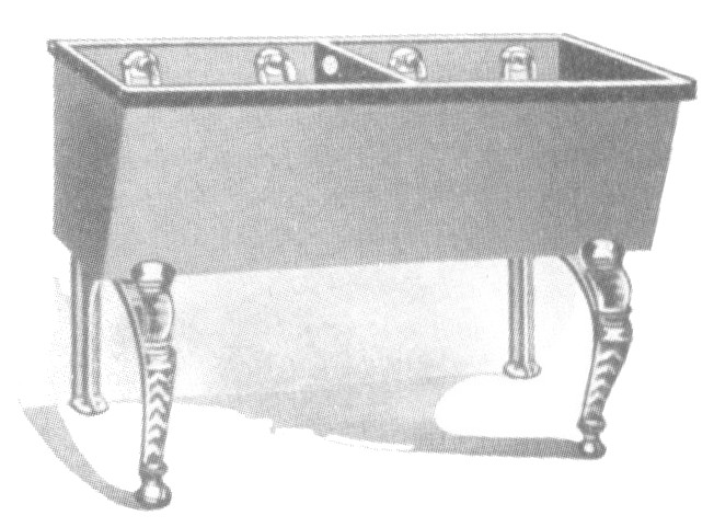 Two-compartment laundry tub made from best grade of imported Portland cement and crushed granite. Moulded in one solid piece. Inside corners are nicely rounded so tub can be easily kept clean. Top edges are fitted with patent metallic rim and wringer guard. See Home Equipment Book for other sizes.