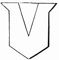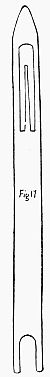 Make Cupid’s bow and arrow of heavy pasteboard, like Fig. 379. Let the bow measure about sixteen inches from tip to tip. Make the arrow twelve inches long, with a point or head three inches, and the feathers two inches, in length on the outside edge. Cut a notch in the feathered end, as shown in Fig. 380.[467] Strengthen the arrow by gluing a thin stick of wood along it to within one inch of the point. Gild both the bow and arrow, tie a silk cord to the tips of the bow, leaving it slack, and force the head of a worsted-needle into the point of the arrow (Fig. 381). Adjust the arrow by fitting the cord in the notch and pulling it back until the cord is taut; then fasten it to the bow by taking a few stitches with yellow silk through the bow and over the arrow. Fig. 382 shows how it should appear when in place.