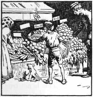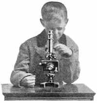 The automobile is made of iron and wood and rubber, and each bit of iron and wood and rubber is made up of tiny particles. The body is made of bones and muscles, covered with skin, and all these are made up of very fine particles that we call cells. Every part of the body is made of these fine cells. The cells are so small that they can be seen only with a powerful microscope. If you look at your hand you cannot see a cell, because it takes a great many cells to make a spot large enough for you to see. In Figure 1 you see a boy looking through a microscope, and beside him you see a picture of what he sees. This picture does not look like the skin on your hand, neither does it look like the skin on the boy's hand; but it is nothing more nor less than a piece of skin taken from that boy's hand, and it looks just as a piece of skin[6] from your own hand would look if you were to see it through a very strong microscope.
