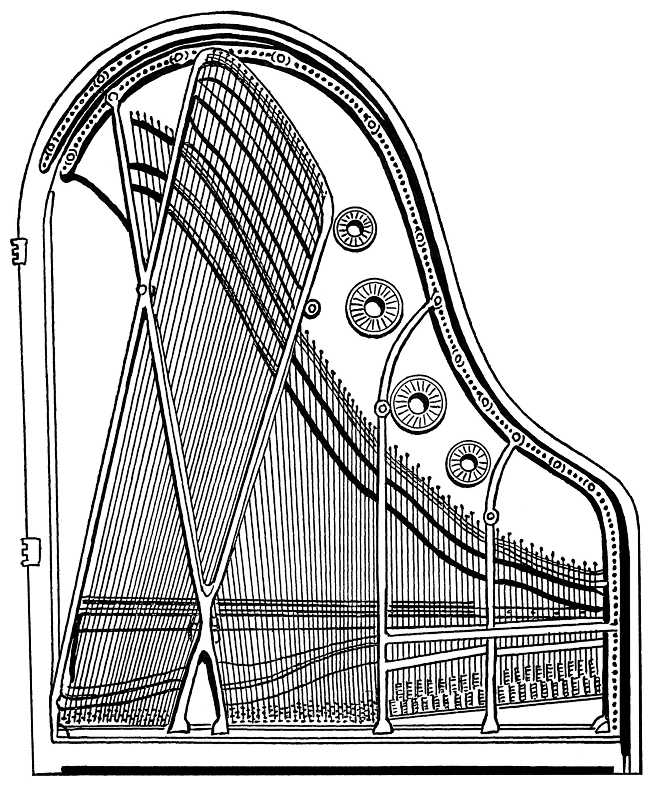 And first, then, let it be remembered that the only line where-from we can safely base any calculation is that which leads in the direction of a continual refinement of the means of applying sound-board construction to the instrument. We must utilize every inch of the superficies; we must discover and apply methods for opening up the vibratory area to the impressions received from the strings in a manner superior to that which has been deemed sufficient when space has been at a discount. We must arrange bridges and bearing-bars so that the string-lengths may be stretched to the utmost, and, lastly, we must use such minute care in the treatment of the hammer-striking line that the inevitable “breaks” in the tone shall be minimized.