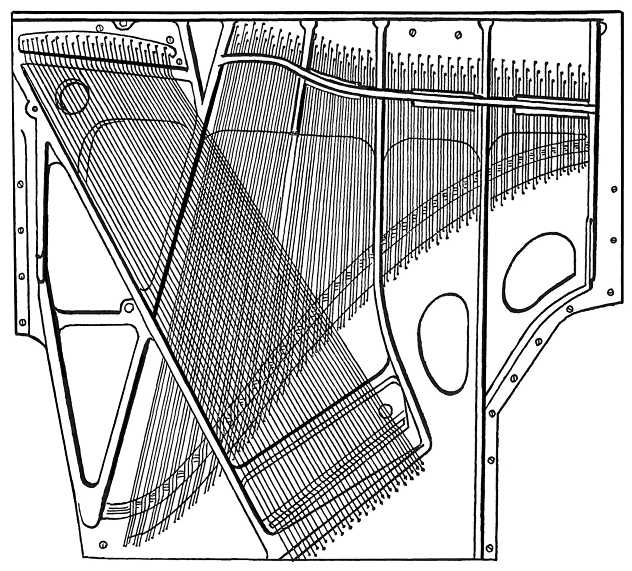 The whole structure is then covered by the “iron plate,” which is a massive affair cast in one piece and bolted all round to the sides of the sound-board and back, and to the wrest plank at the top and the bottom beam at the bottom. This plate contains the “hitch-pins,” over which are looped the waste ends of the strings, and also the iron bridge, which limits the upper extension of their speaking lengths. The strings are arranged upon this elaborate foundation, looped over the hitch-pins, passed over the sound-board—or “belly”—bridges, and thence through the bearing-bar, up to the tuning-pins.