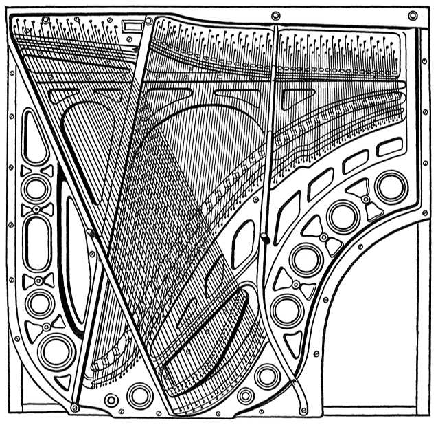 The most obvious dissimilarity between the grand and the upright is, of course, seen in the difference of their planes. The grand might properly be called the horizontal pianoforte. Its strings are stretched parallel to the plane of the floor and the hammers strike upwards at them from below. The second conspicuous difference is in the function of the exterior casing. We have already noted that this part of the upright is chiefly required to complete the exterior ornamentation of the structure, and secondarily to support the keys and action. The case of the grand, on the other hand, is an essential part of the resonant body of the instrument. It consists of a rim, bent to suitable shape and built up of continuous veneers, running all round in one piece and glued together at crossed grain until the desired number of layers and the proper thickness are thus obtained. The whole of what corresponds to the upright back framing, as well as the sound-board and iron plate, are rigidly built into this continuous bent rim, and thus the whole structure forms one complete resonant entity, entirely unified and interdependent. The rim is made deep enough to permit of the insertion of action and keys in the front portion, and a gap in the framing is left for the hammers to strike upwards at the strings. The wrest-plank is placed on one side of the gap and the sound-board occupies the remainder of the space on the other side. The iron plate covers the entire structure, wrest-plank included, and sustains the same relations to the instrument as in the upright. Its shape, as also that of the sound-board, is adapted to the peculiar outline of the grand, which is so aptly implied in the word “fluegel” (wing), used in Germany to designate the entire grand type.
