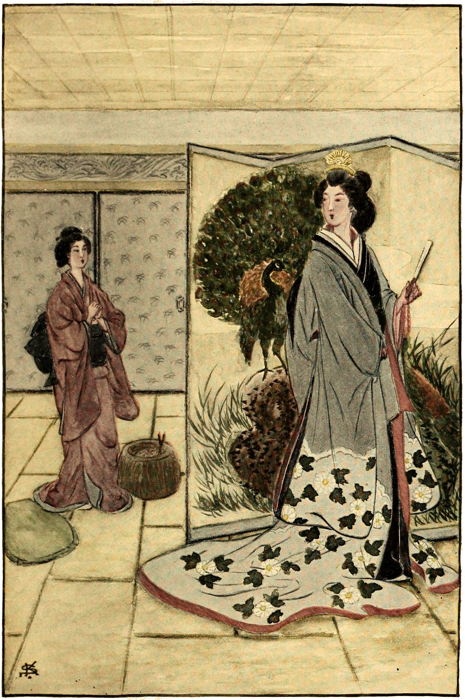As the city was not a great distance away, they could use a comfortable kurumma which would hold them both. Four of the field coolies could be spared as kurumma carriers. In delight the foolish maid dressed her mistress, by this time all rosy with pleasurable excitement and anticipation. The adventure pleased them both, though the foolish mistress assured the foolish maid repeatedly that they would go but to the edge of the city. Thus they could see the great parade of the royal prince pass out of the city gates, for this was the day on which the prince was to leave Echizen and return to Kyoto. All his splendid retinue would accompany him. It was only once in a lifetime one was afforded the opportunity of such a sight, Ohano declared.