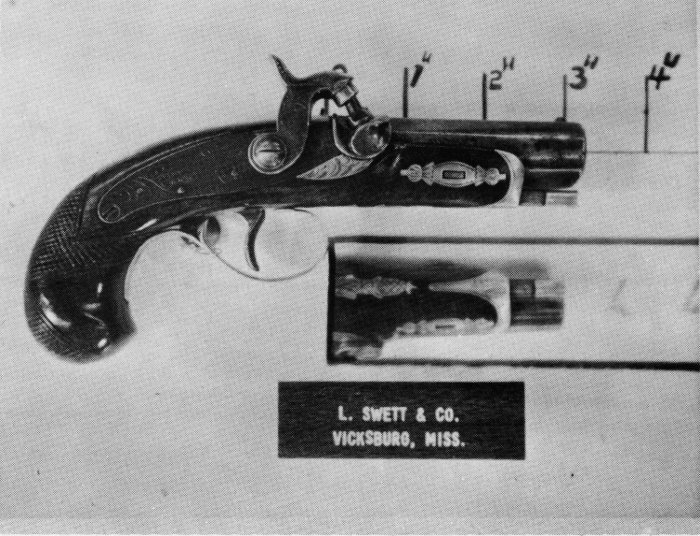 This name represents an agent primarily since no guns not of Henry Deringer manufacture are known. Newspaper advertisements of that period show he operated in the late 1850’s. It is interesting to notice that Mrs. Jefferson Davis carried a Swett derringer in her purse. The gun is now on display in the old capitol museum in Jackson, Mississippi.