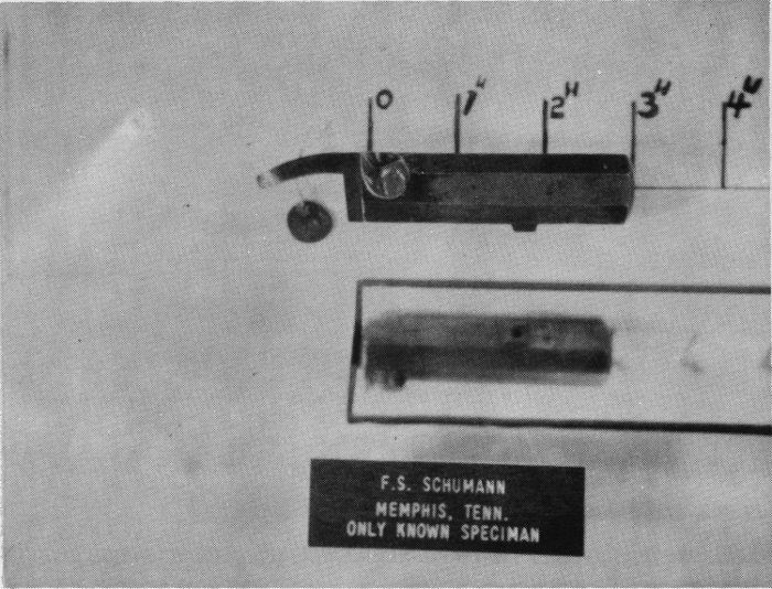 #201 F. Schumann is identified as a maker of derringers by old newspaper accounts. None of my collector friends or dealer friends have ever heard of or seen a genuine Schumann derringer and I am indeed fortunate in obtaining this specimen of a barrel whose caliber is .410 and is full octagon. This barrel turned up in Memphis about twenty-five or thirty years ago in an old gun shop where it was obtained and kept in a collection thereafter. It has never been on a gun and still shows the old original file marks.