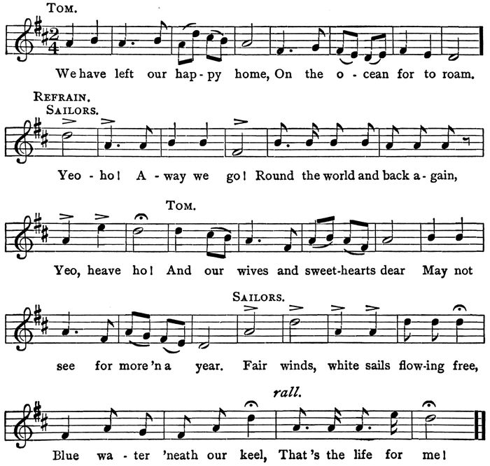 “Once he passed so close to the Reindeer that he nipped off her flying-jib-boom. But the flying jib was not set, of course, in that weather, so it didn’t much matter; and he carried a trysail on the Jane Ellen out of the gaskets with a crack like a cannon. Still they were managing to escape him, when, as the ships happened to be close together, and Torquillon was raging down the channel some distance away, trying to find them in the darkness, Taffy 216heard a sound—different from the screeching of the winds in the rigging—and it seemed to come from the foremast of the Jane Ellen.