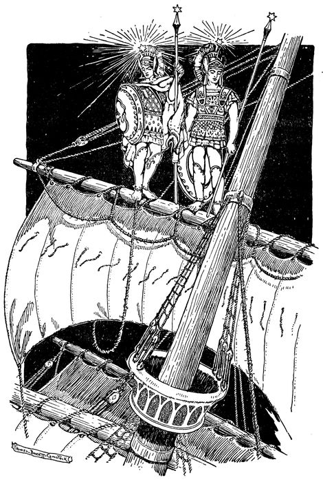 “And in a moment, all the men on both ships were looking and listening. But some could hear only the wind in the rigging and see two little lights hovering about the mast. Some could see and hear a little more; and Taffy,—because he was a Welshman and had a young heart,—more plainly than all, saw, standing lightly on the yards, high, high in the air, the twin brothers, Castor and Pollux! Young and strong, and with star-tipped spears in their hands and helmets on their heads with the white, flaming star streaming from the top like a plume.