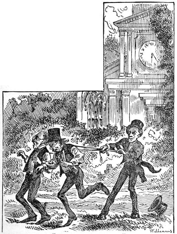 When they got to Whitfield’s cousins—where they expected to stay—they was away from home. Then they went to a second cousins; they was havin’ a funeral. Then they went to a third cousins, and they had the tyfus. Then they went to the only tarvern in the place; they was all right there, only the whoopin’ 564cough; and they never havin’ had it, took it, and come down in nine days—coughed and whooped awful.