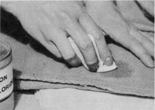 Avoid rings by spreading the cleaning fluid into the area around the stain and at the same time blowing lightly on the spot to dry it quickly. Do not rub—rubbing may cause light and worn-looking spots that are as bad as the stain. Change the pad as it becomes soiled. Finally pat the material with a dry cloth.