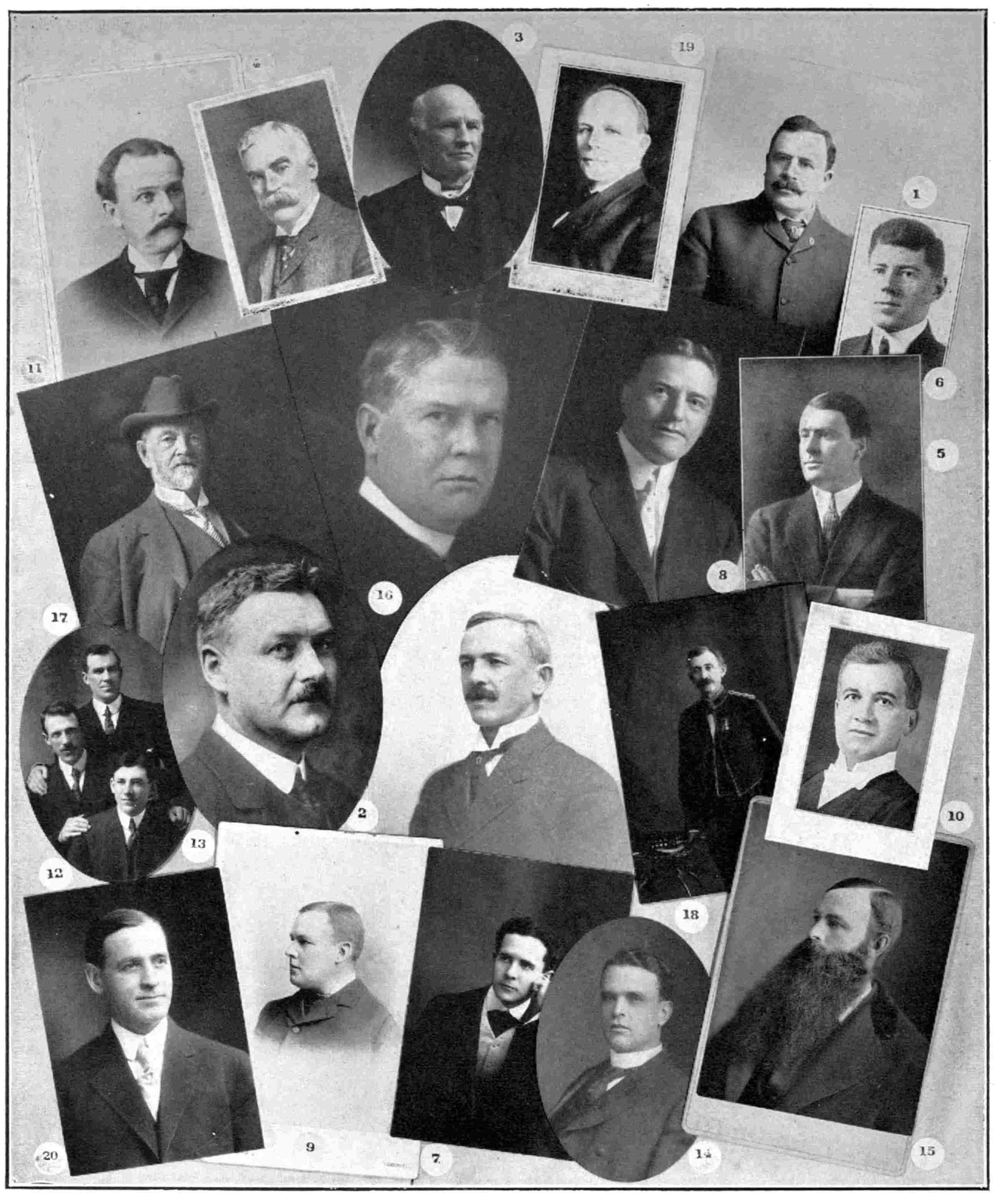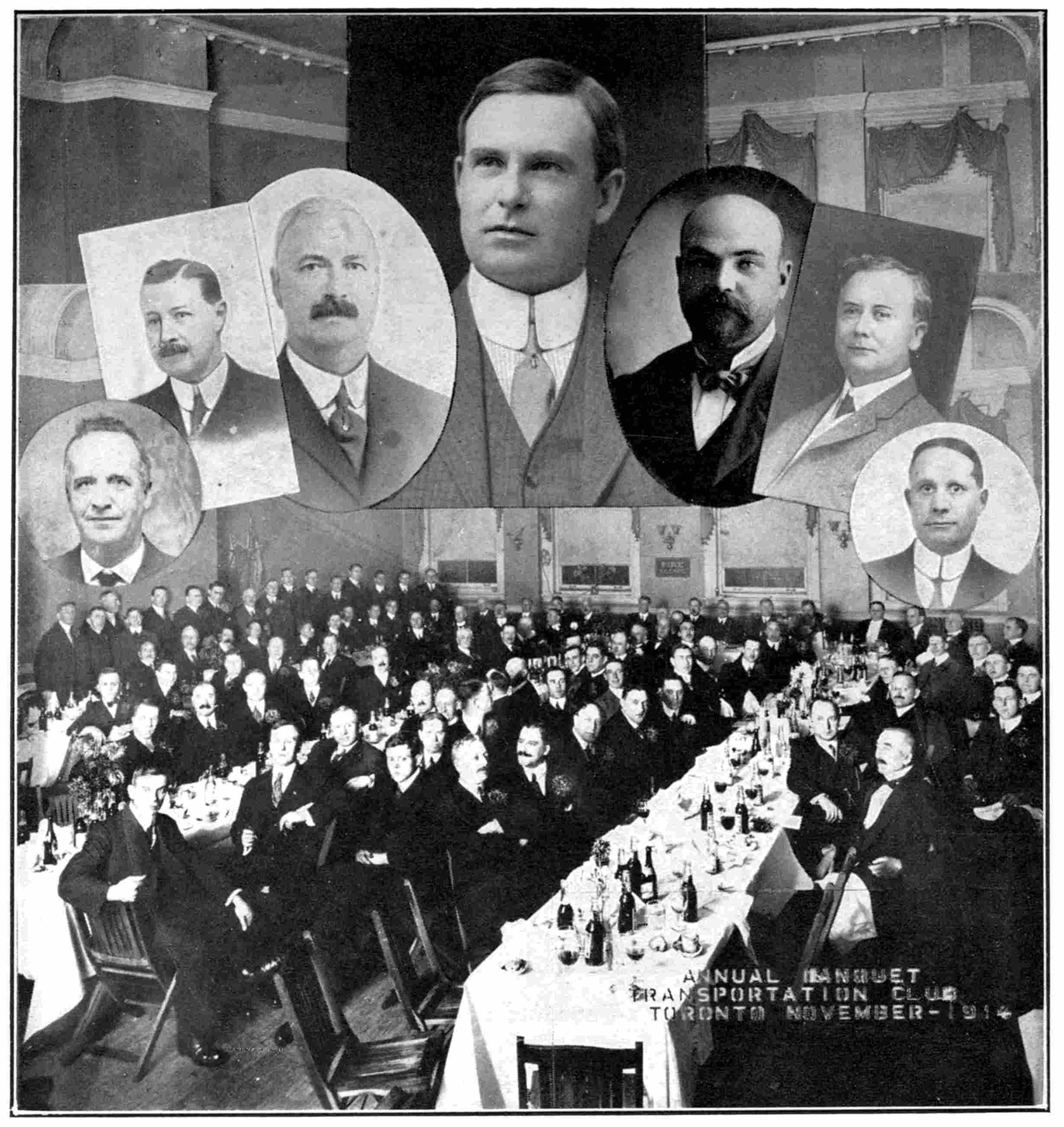 Top rows—W. J. Moffatt, C.P.A., Toronto; L. L. Grabill, Asst. Gen. Bge. Agt., Toronto; M. O. Dafoe, C.P. & T.A., Montreal; J. E. Quick, Gen’l Baggage Agent; F. P. Walsh, G. M., Crosby Tpn. Co., Milwaukee; C. P. Orttenburger, C.P.A., Chicago; J. P. Shea, T.P.A., Boston; A. A. Gardiner, G.C., Montreal.