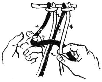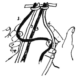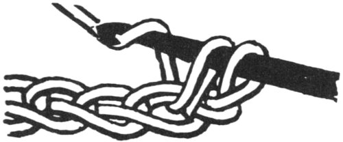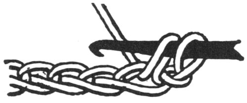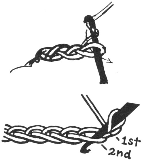 Chain for desired length, skip 1 ch., insert hook in 2nd st. from hook (Ill. No. 1), thread over hook and pull through ch.; there are now 2 loops on hook, (Ill. No. 2). Thread over hook (Ill. No. 3) and pull through both loops (Ill. No. 4).