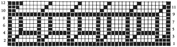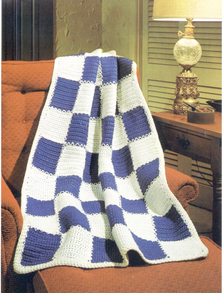 All visual patterns can be knitted. Look at the croc. pattern, find out how many ch. sts. you start out with and cast on one st. less. Use number 8 large size knitting needle. This makes the same gauge—2 sts. to the inch, 2 rows to the inch. When just the border pattern is given, look at the croc. pattern to find out how many rows to make. Most of the patterns for rugs use a double strand of yarn; just hold them together and knit as you would one strand.