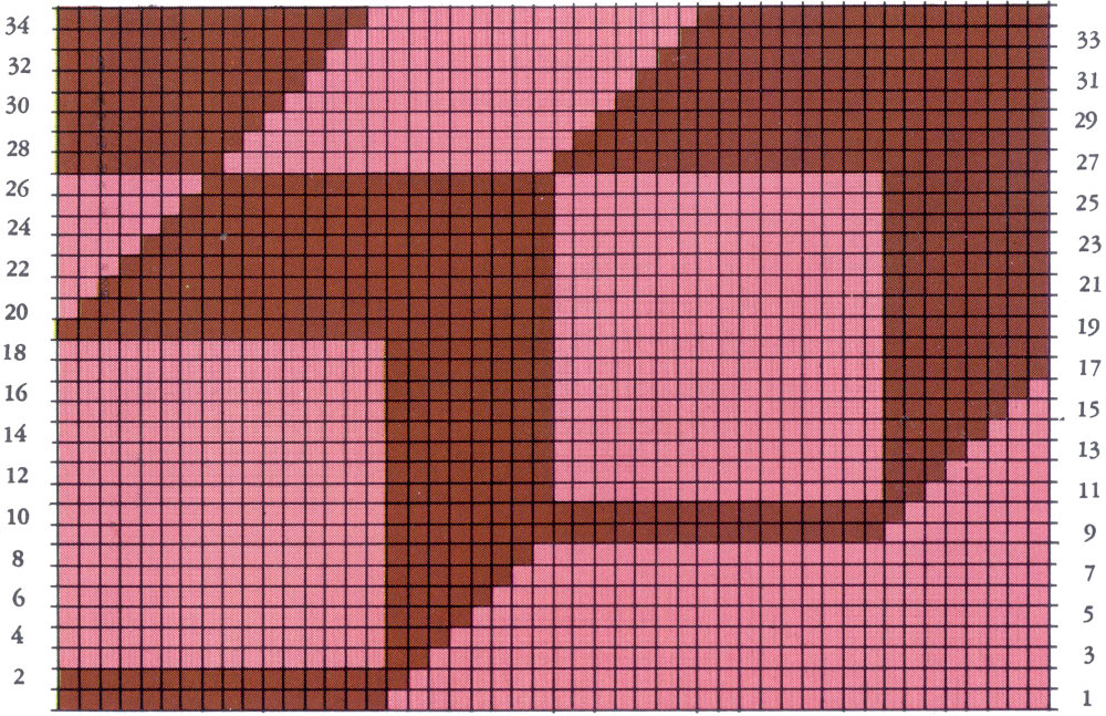 A new idea in crochet. All you have to do is follow the squares on the chart. The basic stitch is the chain used for foundation to start your work. Then the single crochet stitch shown in the diagrams. 1-2-3-4.