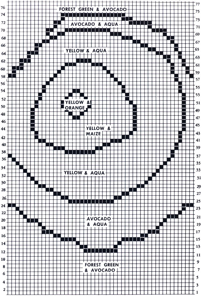 Row 2: Still working with 1st. color—1 sc. in 1st. 26 sts. or as you see in chart back to 2nd color. Let 1st. color hang. Put 1 sc. in next st. using 2nd color (hanging from previous row.) Put 1 sc. with 1st. color (working over the 2nd color) in next 4 sts. Drop these two colors. Pick up 3rd. color (left hanging before.) Put 1 sc. in next st.—let this color hang as before. With 1st. color working over 2nd color put 1 sc. in next 3 sts. Drop 1st. color, using 2nd. color put 1 sc. in next st. (now let this color hang)—with 1st. color put 1 sc. in each st. to end of row—ch. 1—turn. Work in this manner watching the chart. When one color isn’t used for a while (note chart) as in 4th. row color no. 2 isn’t used again til the 17th. row—tie that color off and put it back on again in the 17th. row to keep from having to work over it all the way.