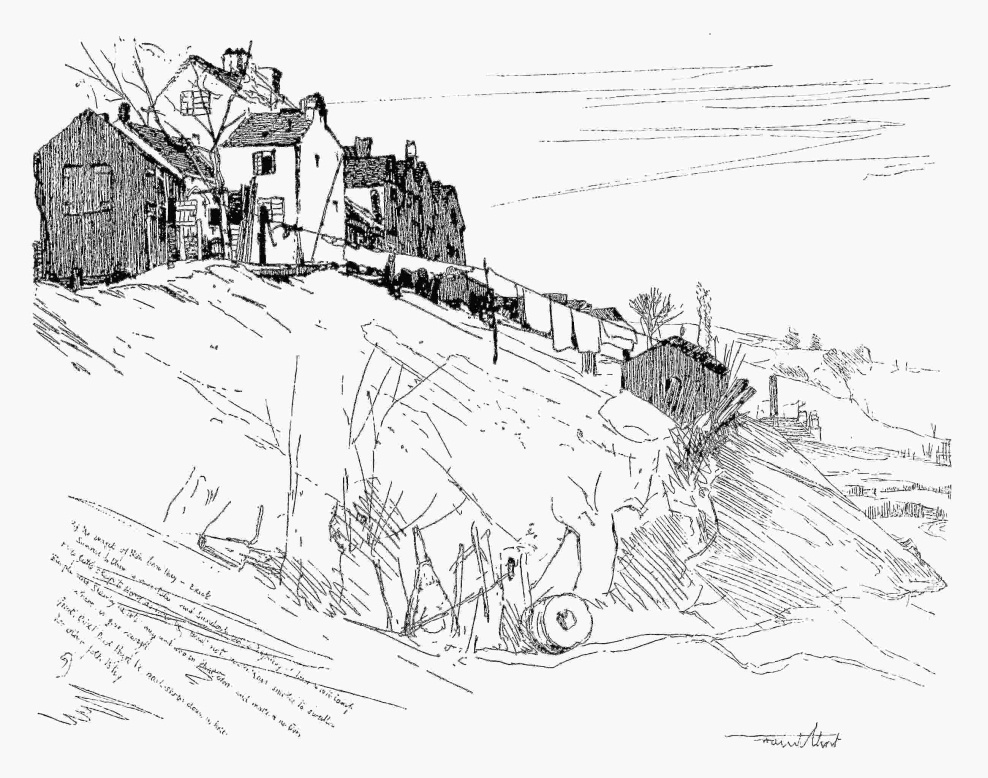 No—when I said they were unlike in nearly everything but the essential quality of impulse, that was clearly an exaggeration. Another thing they have in common besides impulsiveness of temperament and spontaneity of effort—a love of beautiful and of free “line.” Goff will show that in his studies of the hillside, of the shore, of foliage, of the tall grasses of the water-meadow, and of the winding stream; Helleu will show it in his studies of the most modern humanity, of the “Parisienne de Paris”—all that is most completely of the capital, subtle, refined, over-refined—but with how{120} extenuating an elegance!—or, now again, of the young grace of well-bred girlhood, as in a certain “Etude de Jeune Fille,” with its wonderful union of Nineteenth-Century vividness with the grace of Reynolds or Gainsborough. And yet one other thing belongs to them in common—to these two men whose work presents, most certainly, in method as in subject, many a point of contrast. Both, being artists essentially, rather than merely skilled practitioners in a particular medium, swear no unbroken constancy to the art of the etcher—cannot avoid the keen perception and keen enjoyment of those “effects” and combinations for which it is not etching that affords the readiest or most appropriate means of record. And accordingly we have from Monsieur Helleu, pastels; from Colonel Goff, water-colour, wash heightened with pen-work, or pencil drawings, marked sometimes with a strong accent, at others blond and suave as silver-point itself.