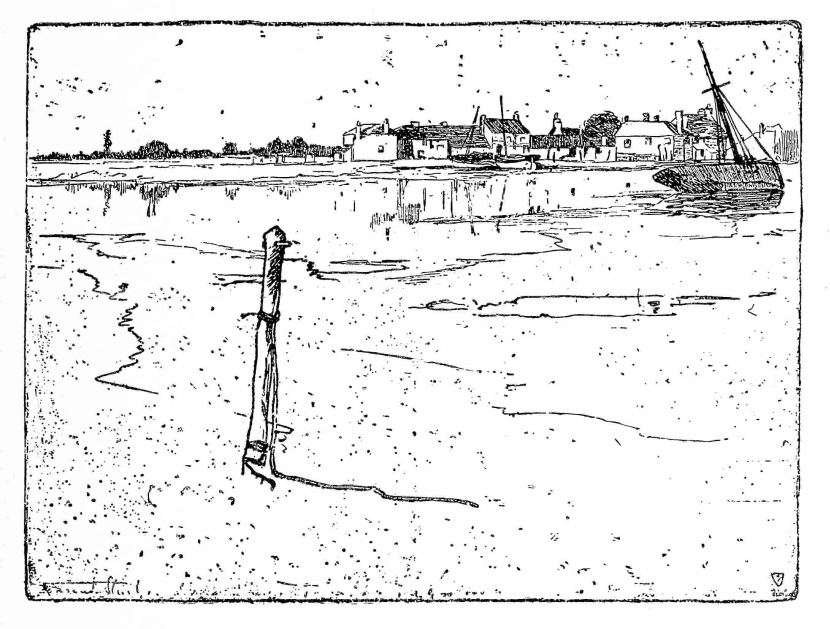 work not proceeding to a conscious elaboration, yet not stopping short of the point at which even for the many it may be expressive. Its quality, however, good as it is, does not really give it a unique place in the list of Gof labours; other plates—some that would be considered very humble ones—show virtues quite as valuable. Few etchers are Gof equals, fewer still go beyond him, in composition of line, in arrangement of light and shade; and as he firmly possesses this science, it is natural that very many of his plates, and not only one or two of them, should satisfactorily display it. “Norfolk Bridge, Shoreham”—of which a reproduction is given here—displays it delightfully. The unity of impression is complete; the grouping well-nigh faultless—there is the light arch of the bridge and the dark mass of clustered town behind it; church and houses and timbered sheds set amidst the winding of tidal waters; muddy shores, from above whose low sky-line there rises now and again the mast of a fishing-smack.