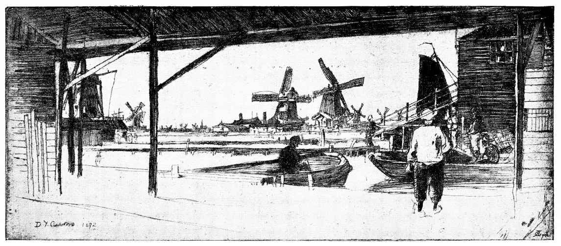 During the last five or six years, with a creditable and natural reaction from what would seem to have been a fever of immature fruitfulness—in the midst of which, after all, this exquisite and ever dainty artist did, of course, nothing ugly, though much that was rather provokingly thin—Mr. Whistler has, from time to time, produced a few new plates of serious interest and of finest accomplishment. The Brussels group belongs, in spirit, if not precisely in fact, to these latest years; and charming is the seeming intricacy, yet assured lightness,{42} of the Whistlerian treatment of Flemish house-front. Again, there are delightful little things wrought in the country of the Loire: not solid records, but, as it were, fleeting visions of its architecture, and very fascinating. But the best of all the later work, and it is among the very latest that has yet been seen, is the quite admirable “Zandaam,” over whose stretched line the breeze from across dyke and fen and Zuyder Zee, stirs here, stirs there, stirs everywhere, the wings of the windmills of Holland.{43}