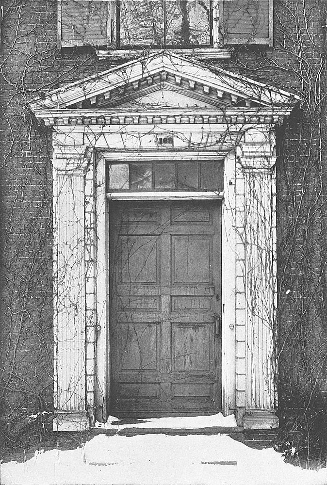 The doorway of the West house at 12 Chestnut Street maintains the best traditions of Colonial architecture. The fluted columns, dentiled architrave,[Pg 73] plain top- and side-lights, and fine old six-paneled door, present a pleasing ensemble. The capitals contain a hint of the Egyptian in the use of the lotus-leaf.