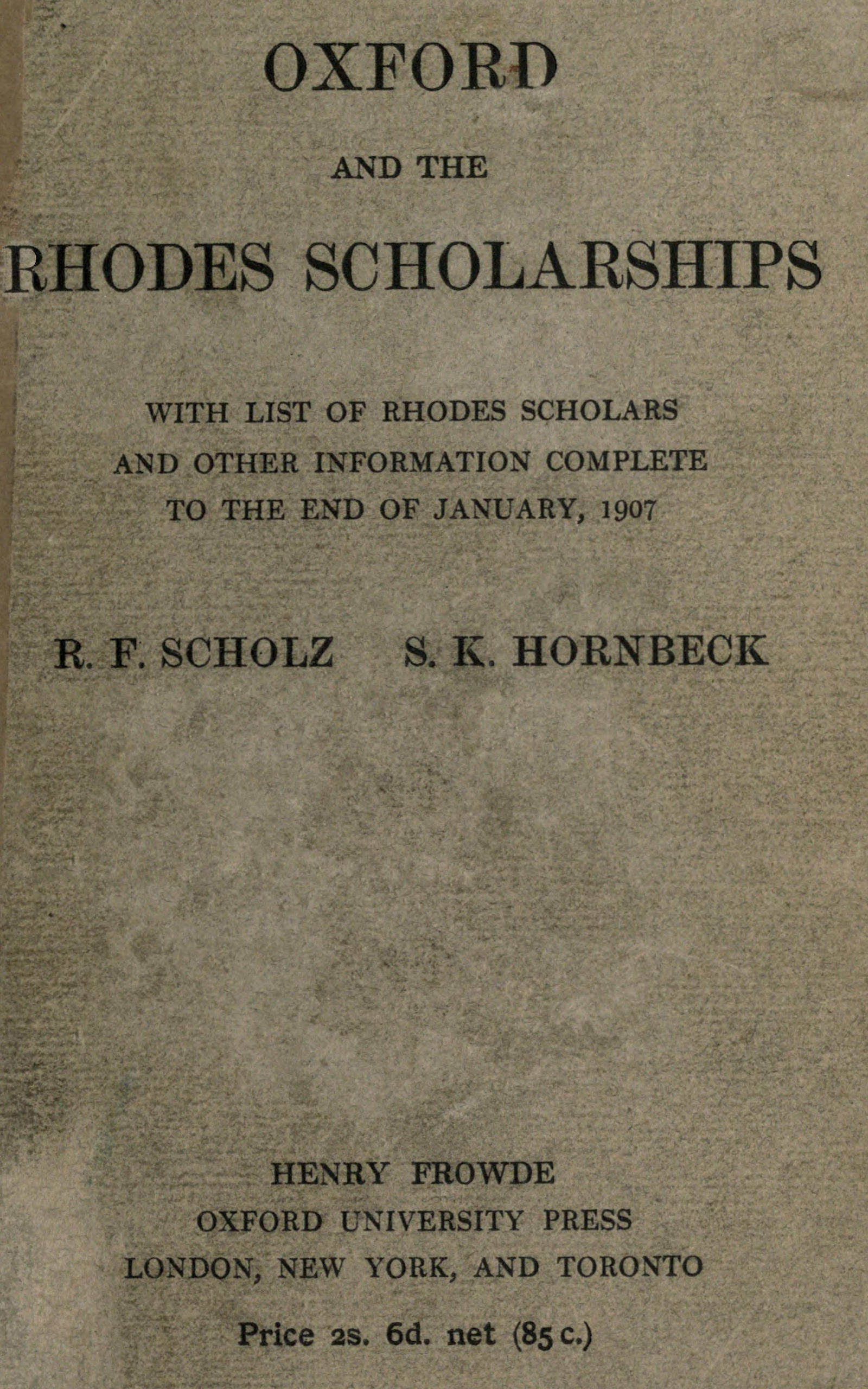 Although disclaiming all or any official authorization, and wishing to involve no one in the responsibility for the appearance or the character of these chapters, we feel that it would be misleading and ungrateful not to acknowledge our indebtedness to those without whose assistance much of the information could not have been obtained, or could only have been obtained with great difficulty. We have occasion to thank, for very material assistance and for many valuable suggestions, Dr. G. R. Parkin, Mr. F. J. Wylie, and Mr. H. T. Gerrans. Dr. Parkin and Mr. Wylie, as officially connected with the Rhodes Trust, have given[vi] us access to Memoranda, and have given information on many points connected with the Scholarship System. Mr. Gerrans, Fellow of Worcester College, has explained and furnished information on many difficult points in the Oxford system, and has otherwise considerably simplified the problem of arrangement and publication. Our thanks are due also to Mr. L. Cecil Jane of University College for very helpful suggestions. For whatever errors or shortcomings may be discovered we alone are responsible.