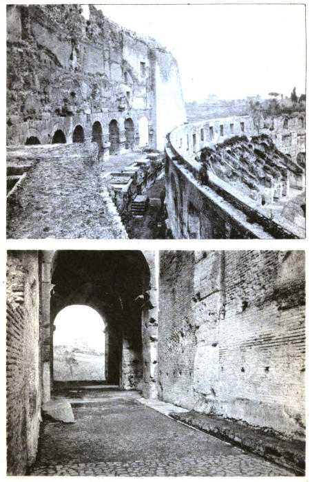 The great excavations carried on in this colossal building in the years 1874 and 1875, have thrown an entirely new light on its history. These were made under the level of the ground, at the foot of the podium, which is the same as that of the original arena; this large level space had been indifferently called the ground, the floor, the stage, the area, or the arena; no one had any idea that the original pavement would be found 21 ft. below that level, and that the intervening space was filled with walls and passages, dens for wild beasts, places for lifts to send up men, and dogs, and animals: and canals for water, and several other contrivances for the use of the performers on the stage above, for practically the arena was the stage on which the performances took place. These excavations have enabled us to ascertain that this had been a boarded floor covered with sand, or arena (whence its name), and that this floor could be moved and replaced in a short time, at the word of the Emperor[1]. The evidence of this is brought out clearly in the present work. Large corbels, or brackets, are provided for placing the boards upon when removed, and keeping them out of sight of the people in the galleries; they project from the wall below the podium, in the passage over the dens[2].