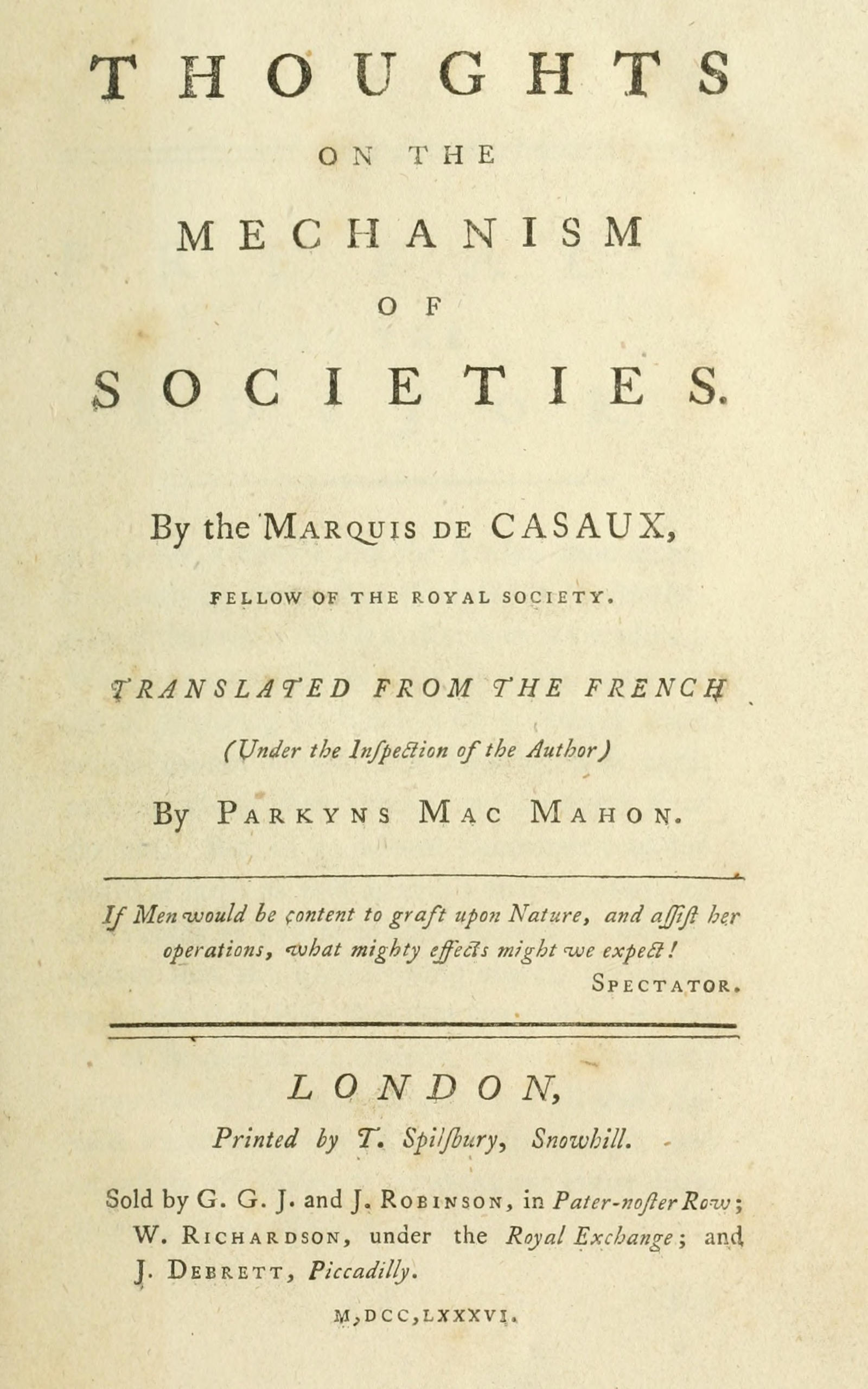 It is not a treatise that the Author announces; it is nothing more than Thoughts on the Mechanism of Societies. Such a title does not confine a Writer to a regular plan; it saves him even the risk of preparing his Readers for a chain of ideas which cannot escape their sagacity if it exist, and on which they cannot be deceived if it do not. But in a picture consecrated to the world at large as well as to his own Country, to the People as well as to their Rulers, it was necessary that the most striking object, the object to which their first attention was called, should be of so general an interest, as to entice them progressively to an investigation of all those details which deserve most to be scrutinised, and of which the different relations are either little known, or greatly mistaken.