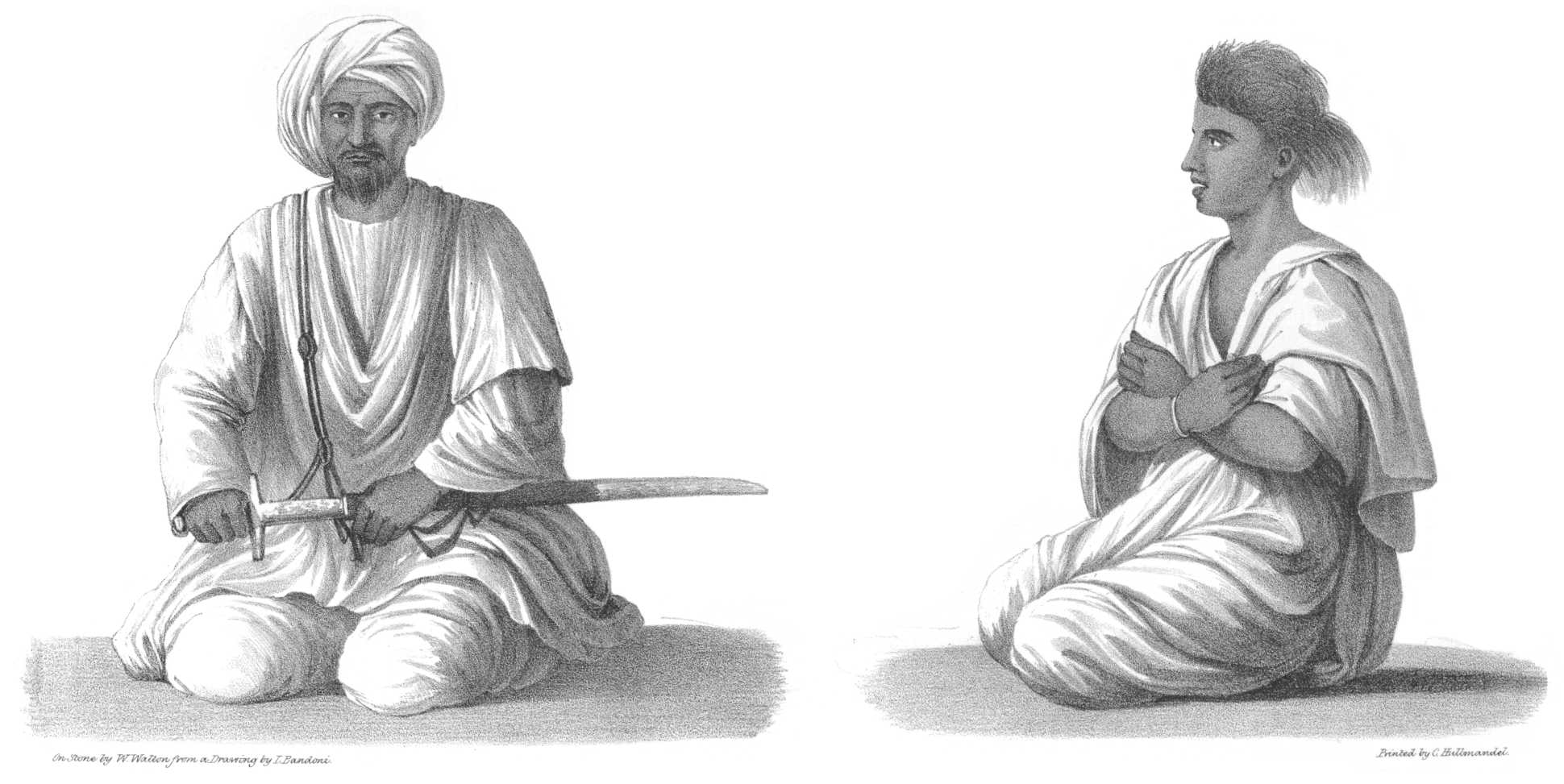 Visit to the Governor. — Court and ancient Chiefs of the Country. — Hospitable Reception. — Turkish Entertainments. — Character of the Governor. — His Attentions. — Style of living. — Dongolah Horses. — Anecdotes, Costumes, and Portraits of the Chiefs. — Turkish Knowledge of the Arts. — Bazaar of Makkarif. — Houses. — Manufactory of Indigo. — Extent of Cultivation. — Population. — Camels’ Hides. — Sugar Manufactory. — Ethiopian Wool. — Bishareen Tribe. — Manner of collecting their Tribute. — Ababdes and other Arab Tribes. — Turkish Policy. — Burckhardt. — Character of the People. — Arabs of the Desert 44