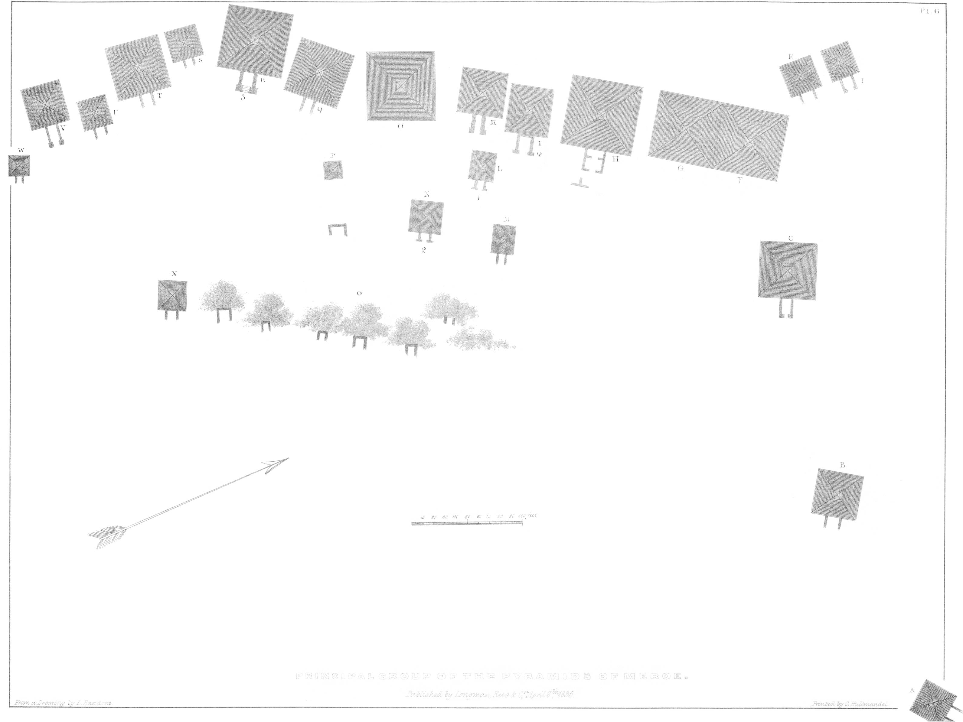 Historical Evidence that this is the Cemetery of the Capital of Ethiopia. — The imposing Appearance, Number, Position, and Dimensions of the Pyramids. — Ethiopian Arch. — Proofs that the Knowledge of the Arts descended front Ethiopia. — Edifices of a pyramidal Form the best adapted to resist the Ravages of Time. — Peculiar Style of the Sculpture. — The Language of Hieroglyphics generally known in Ethiopia. — The Style of the Sculpture the Criterion of the Age. — Monumental, geological, and historical Evidence that the Knowledge of the Arts descended from Meroe. — Description of the Sculpture. — Name of Meroe on the Monuments. — Meroe peculiarly interesting, as the Birth-place of the Arts. — Sandstone Quarries. — Site of the City. — Villages of the present Inhabitants. — Agriculture. — Cailliaud 66