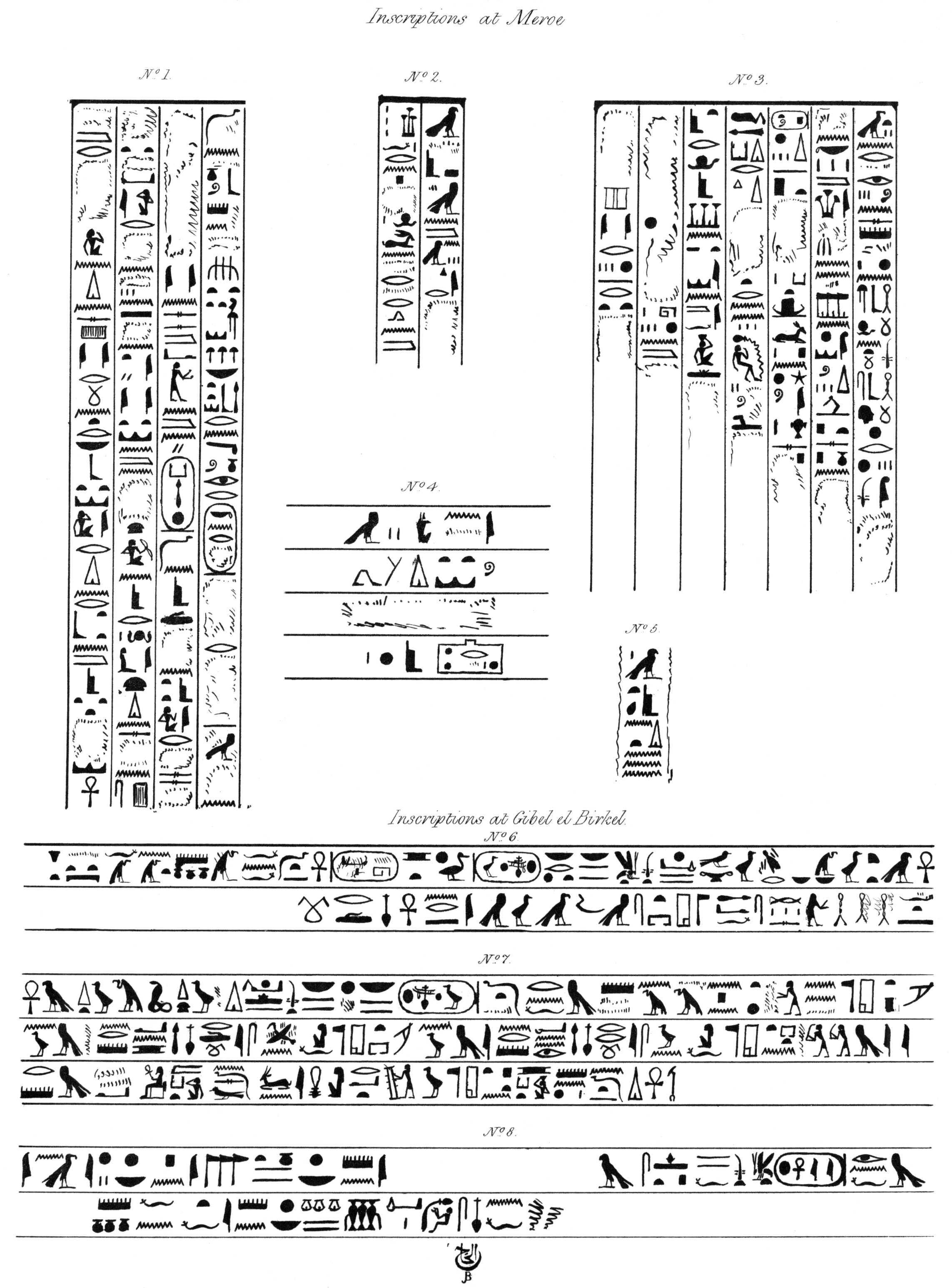 [50]Inscription No. 1. is from the same portico, and opposite to a large figure, similar to the one in Plate X., Sculpture, Meroe. No. 2. is before a figure presenting offerings. No. 4. before a figure of Anubis. No. 5. before a figure of Horus. The tablet, No. 3. is in the same portico, over a figure kneeling before a funeral boat, very much defaced, at the end of the portico. As will be seen by the plate, these inscriptions are very much injured; but, although the least perfect of any that I possess, I publish them, because they are the most important, being from the pyramids of Meroe. No. 6. is an inscription which was above the sculpture on one side of the first chamber excavated out of the rock of the Temple of Tirhaka, Gibel el Birkel. No 7. is another portion of this apparently dedicatory inscription, going round the whole of the room. The hieroglyphics are large, well executed, and very legible, except some which were quite defaced, and others almost covered with dirt. No. 8. are fragments from the large granite altar in the western corner of the great Temple, Gibel el Birkel. The first line is on the south-east side, the second on the north-east; the remainder of the hieroglyphics on this altar I have not been able to publish. Plate LIII. shows the two subjects on the altar in the sanctuary of the same temple. (See Plate XXIV.) I have alluded to them in my description of the ruins.