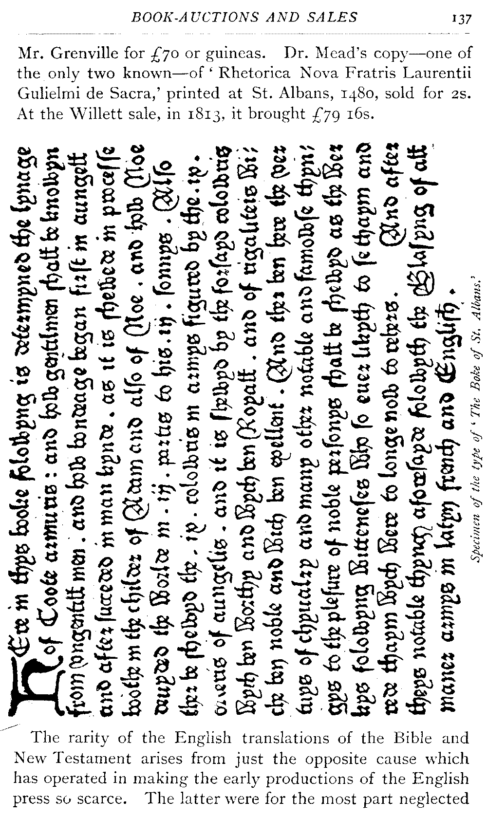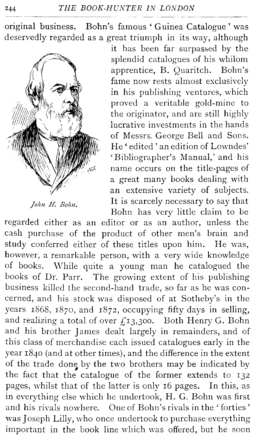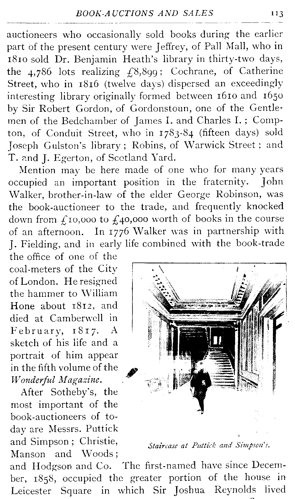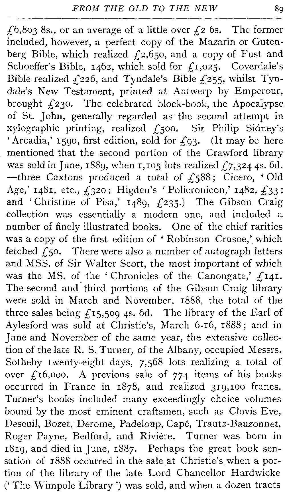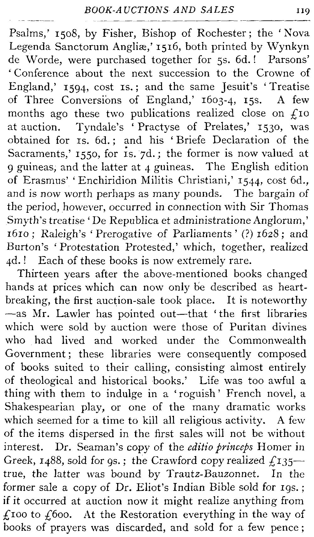 Half a century ago one of the most inveterate frequenters of book-auctions was a certain Dr. G., of diminutive stature, on account of an awkward deviation of the spine. At that time the appearance of a private purchaser at a sale was a very rare event, and one which, when it occurred, invariably met with a more or less hostile reception from the fraternity. Dr. G.'s first appearance produced a good deal of sensation. The hunchback, it is true, was rather shabbily dressed, but 'l'habit ne fait pas le moine,' and is certainly no trustworthy index to the pockets of the wearer. Excitement reached fever-heat when a Wynkyn de Worde was put up and persistently contested for by the doctor, who ran it up against the booksellers present (some of whom quickly desisted from the fun for fear of burning their fingers), one of whom, far exceeding his commission, obstinately refused to give in until the book was knocked down to him to his own dismay, and the delight and ironical compliments of his colleagues. After this contretemps the doctor had it pretty much his own way; his name was duly entered on the sale catalogue, and his address was known. The next day our bookseller, sobered by reflection, called on the doctor, confessed his sin of the previous day, humbly asked for absolution, and offered him the book at an immense loss on the sale price. 'If you were,' replied the doctor, 'to bring the book at my door for nothing, I would take it with a pair of tongs and drop it into the gutter.' It was a puzzle to everyone what the little doctor did with all his purchases, which were limited chiefly to classical books. At [xxx]his death, however, it transpired that he bought for the various Universities of the United Kingdom. The doctor's son, a poor curate, entered his late father's library for the first time, and found there a mass of books, which occupied nearly a month in selling, and realized, to his delight, a large sum of money.