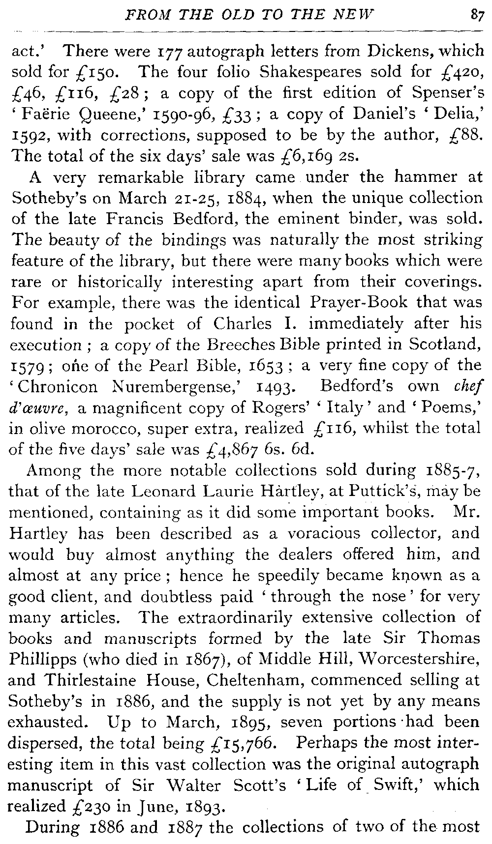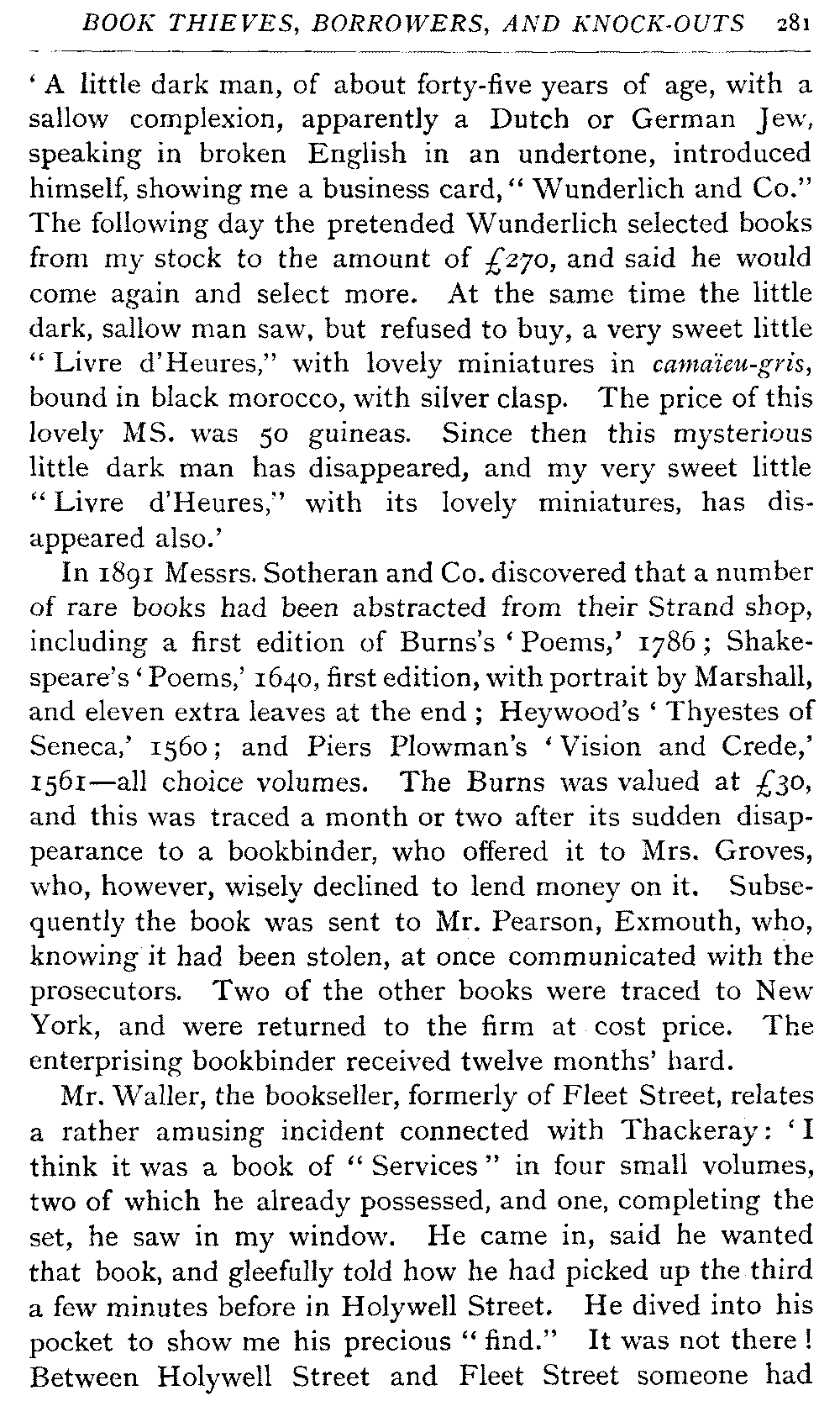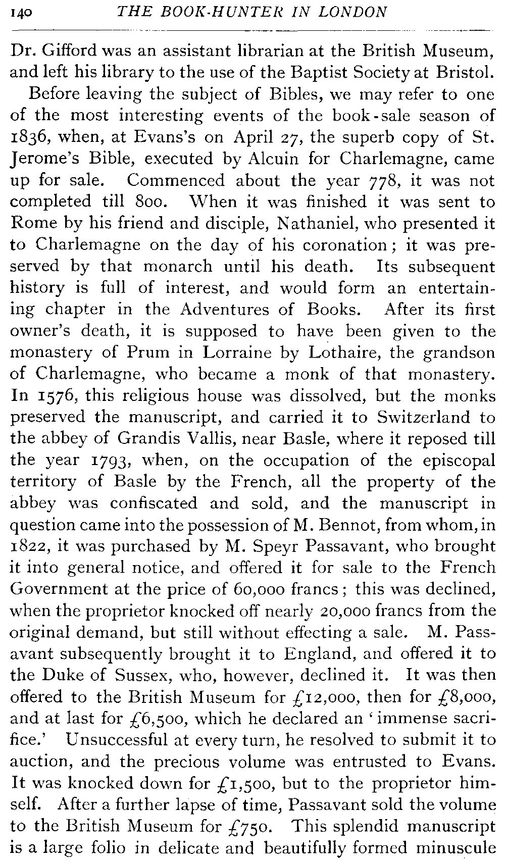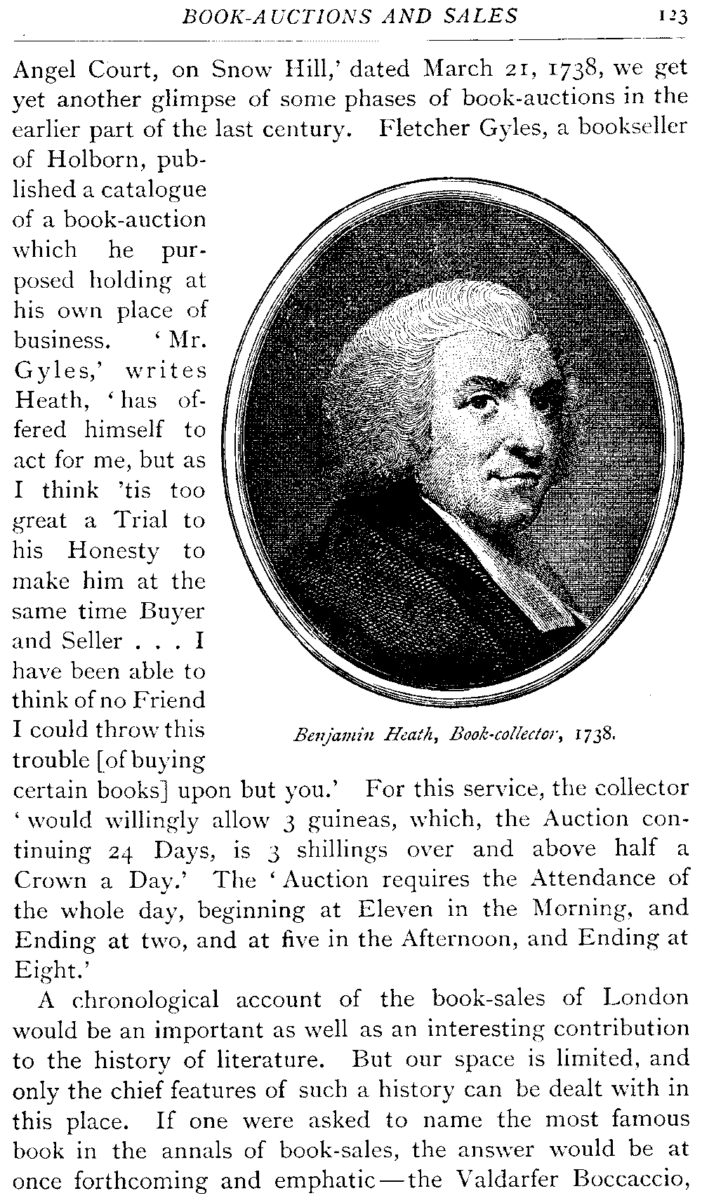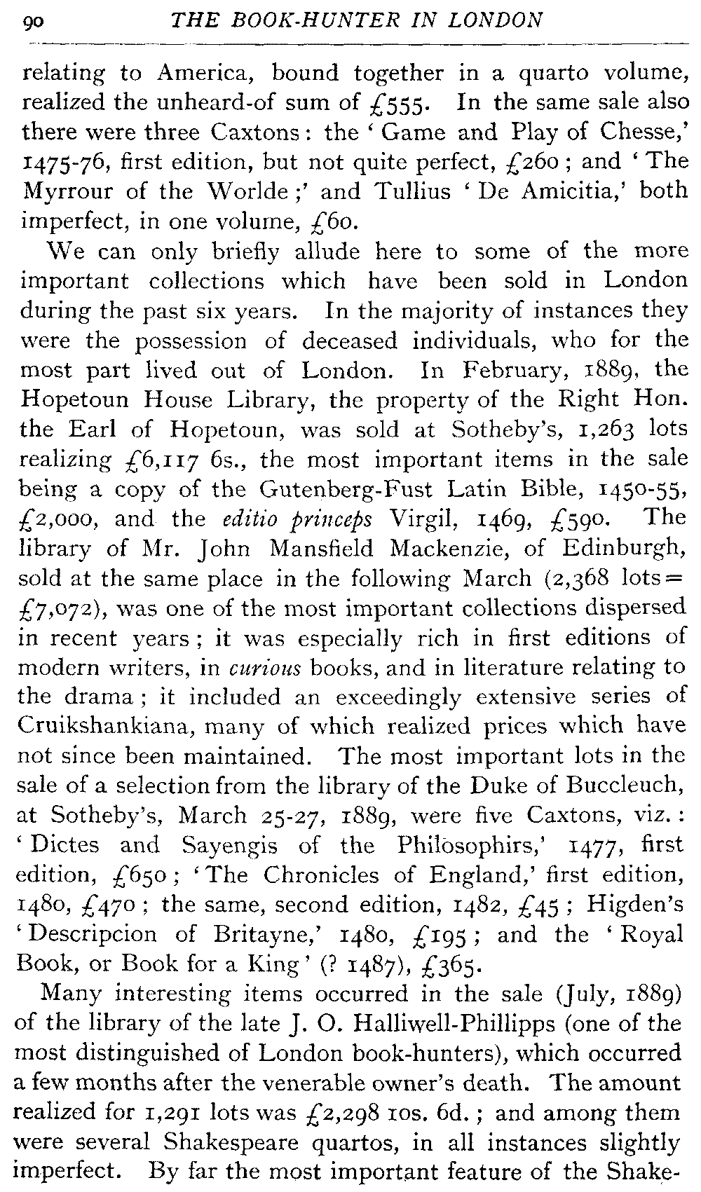 Half a century ago one of the most inveterate frequenters of book-auctions was a certain Dr. G., of diminutive stature, on account of an awkward deviation of the spine. At that time the appearance of a private purchaser at a sale was a very rare event, and one which, when it occurred, invariably met with a more or less hostile reception from the fraternity. Dr. G.'s first appearance produced a good deal of sensation. The hunchback, it is true, was rather shabbily dressed, but 'l'habit ne fait pas le moine,' and is certainly no trustworthy index to the pockets of the wearer. Excitement reached fever-heat when a Wynkyn de Worde was put up and persistently contested for by the doctor, who ran it up against the booksellers present (some of whom quickly desisted from the fun for fear of burning their fingers), one of whom, far exceeding his commission, obstinately refused to give in until the book was knocked down to him to his own dismay, and the delight and ironical compliments of his colleagues. After this contretemps the doctor had it pretty much his own way; his name was duly entered on the sale catalogue, and his address was known. The next day our bookseller, sobered by reflection, called on the doctor, confessed his sin of the previous day, humbly asked for absolution, and offered him the book at an immense loss on the sale price. 'If you were,' replied the doctor, 'to bring the book at my door for nothing, I would take it with a pair of tongs and drop it into the gutter.' It was a puzzle to everyone what the little doctor did with all his purchases, which were limited chiefly to classical books. At [xxx]his death, however, it transpired that he bought for the various Universities of the United Kingdom. The doctor's son, a poor curate, entered his late father's library for the first time, and found there a mass of books, which occupied nearly a month in selling, and realized, to his delight, a large sum of money.