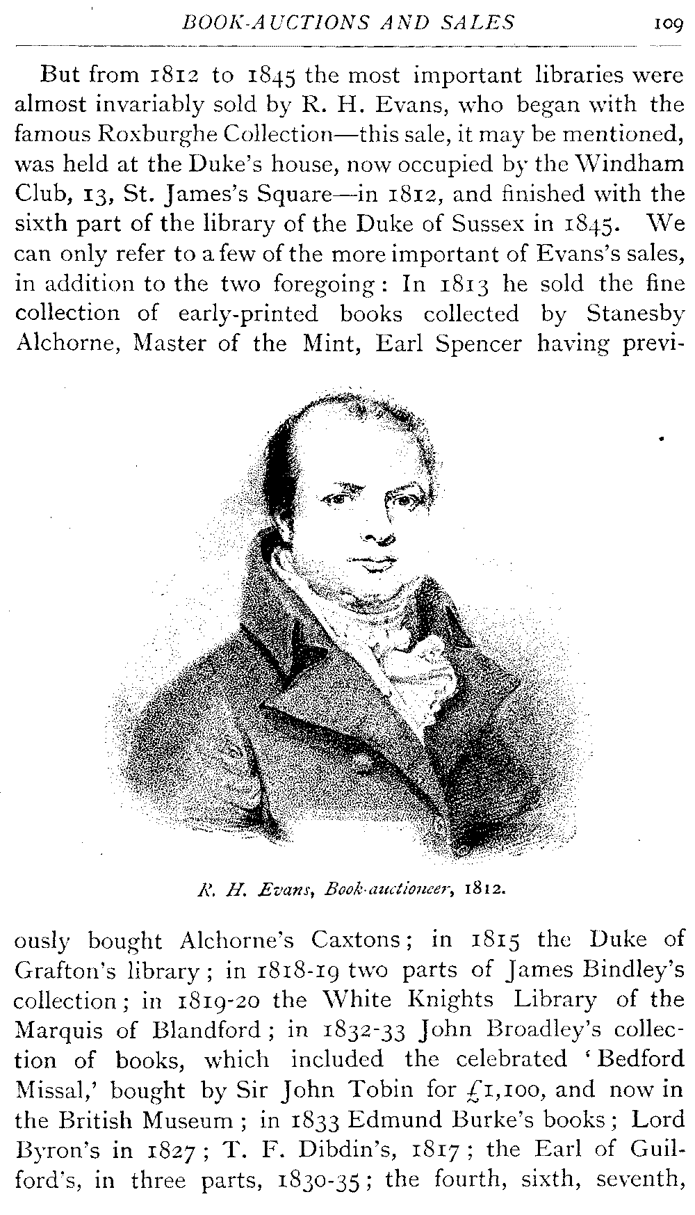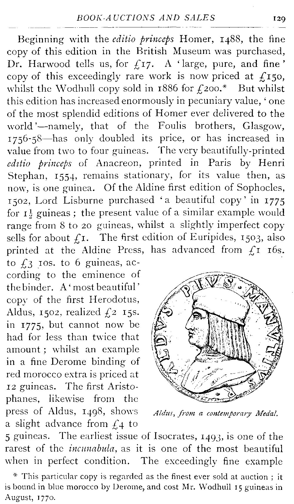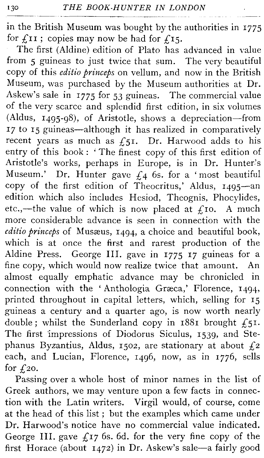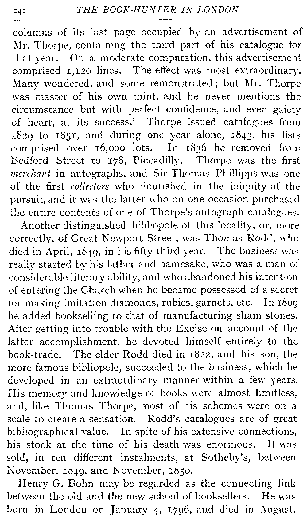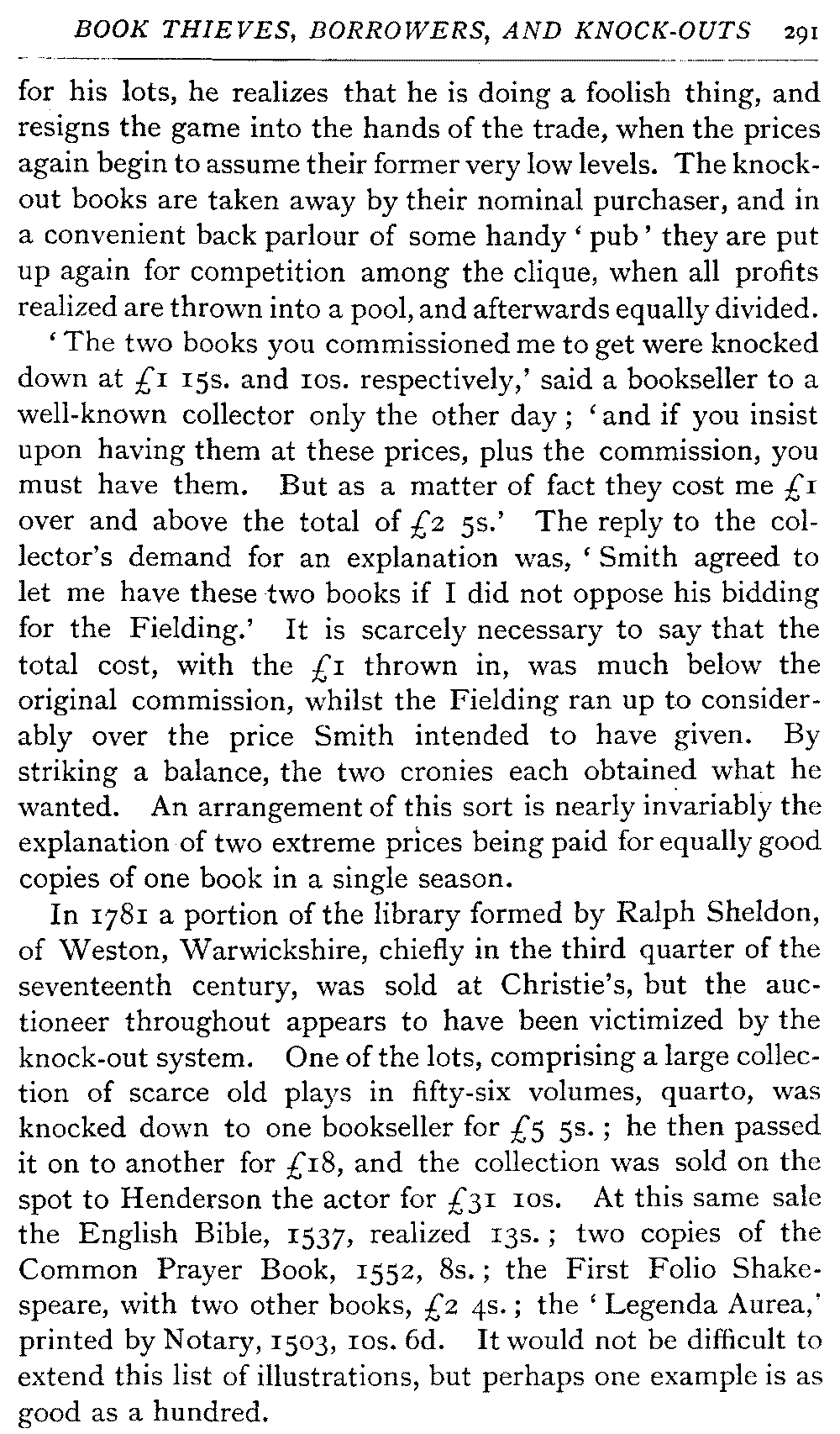 Half a century ago one of the most inveterate frequenters of book-auctions was a certain Dr. G., of diminutive stature, on account of an awkward deviation of the spine. At that time the appearance of a private purchaser at a sale was a very rare event, and one which, when it occurred, invariably met with a more or less hostile reception from the fraternity. Dr. G.'s first appearance produced a good deal of sensation. The hunchback, it is true, was rather shabbily dressed, but 'l'habit ne fait pas le moine,' and is certainly no trustworthy index to the pockets of the wearer. Excitement reached fever-heat when a Wynkyn de Worde was put up and persistently contested for by the doctor, who ran it up against the booksellers present (some of whom quickly desisted from the fun for fear of burning their fingers), one of whom, far exceeding his commission, obstinately refused to give in until the book was knocked down to him to his own dismay, and the delight and ironical compliments of his colleagues. After this contretemps the doctor had it pretty much his own way; his name was duly entered on the sale catalogue, and his address was known. The next day our bookseller, sobered by reflection, called on the doctor, confessed his sin of the previous day, humbly asked for absolution, and offered him the book at an immense loss on the sale price. 'If you were,' replied the doctor, 'to bring the book at my door for nothing, I would take it with a pair of tongs and drop it into the gutter.' It was a puzzle to everyone what the little doctor did with all his purchases, which were limited chiefly to classical books. At [xxx]his death, however, it transpired that he bought for the various Universities of the United Kingdom. The doctor's son, a poor curate, entered his late father's library for the first time, and found there a mass of books, which occupied nearly a month in selling, and realized, to his delight, a large sum of money.