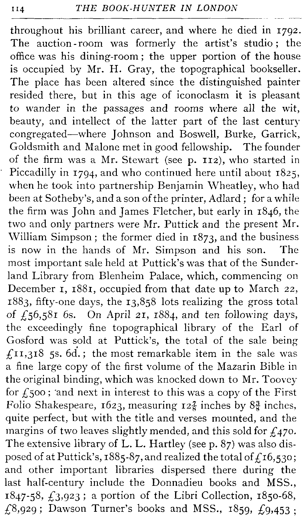 The greatest possible care has been taken to prevent inaccuracy of any kind, but whilst freedom from error is a consummation which every author desires, it is also one of which few can boast. The reader will be doing the author a favour by informing him of any mistake which may be detected in the following pages. An omission in the account of Stewart, the founder of Puttick's, may be here made good: he had the privilege of selling David Garrick's choice library in 1823. The author regrets to learn that Purcell (p. 165), a very intelligent bookseller, died some months ago.
