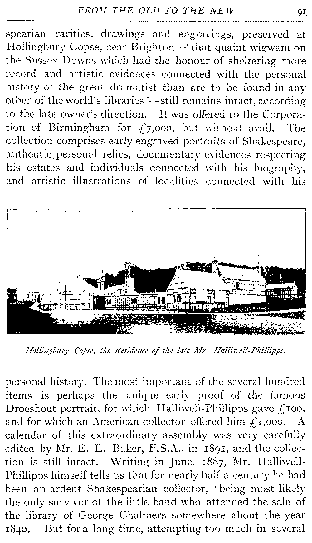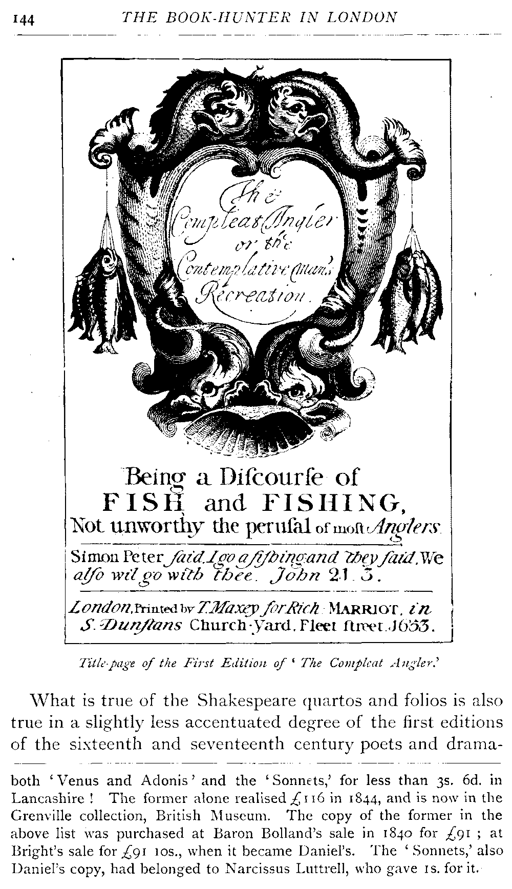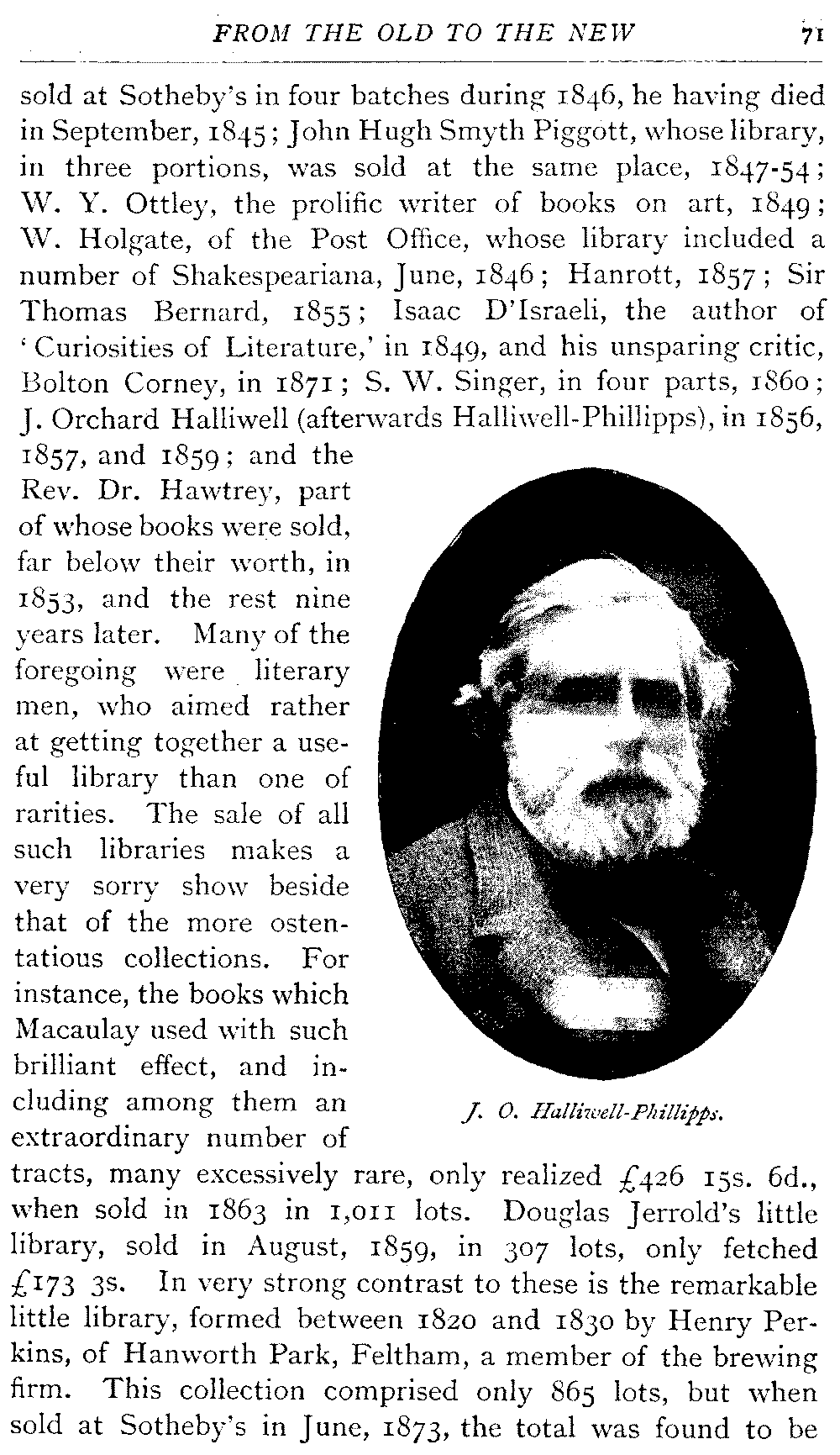 In a letter to Justin Windsor, the late J. Orchard Halliwell-Phillipps gave some very curious and interesting information respecting book-collecting in the earlier half of the present century. 'About the year 1836,' he wrote, 'when I first began hunting for old books at the various stalls in our famous London city, black-letter ones and rare prints were "plenty as blackberries," and I have often found such things in unlikely places and amidst a mass of commonplace rubbish, exposed for sale in boxes labelled, "These books and pamphlets 6d. or 1s. each," outside an old bookseller's window, where another notice informed the passer-by that "Libraries were purchased or books bought;" and thus plainly showed how such now indeed rarities came into the possession of an ignorant bibliopole. It was not, however, till about 1840 that I turned my attention to the more special work of collecting Shakespeare quartos, in which, I may say, I have been very successful. It was at one of George Chalmers' sales that I first bought one or two, and after that I hunted for them in all parts of the country, and met with considerable success, often buying duplicates, and even triplicates, of the same edition and play. At one time I possessed no less than three copies of the very rare quarto edition of "Romeo and Juliet," 1609, and sometimes even had four copies of more than one of the other quartos. Not so very long before this period, old Jolley, the well-known collector, picked up a Caxton [xxvii]at Reading, and a "Venus and Adonis," 1594, at Manchester, in a volume of old tracts, for the ignoble sum of 1s. 3d. Jolley was a wealthy orange-merchant of Farringdon Street, London, and entertained me often with many stories of similar fortunate finds of rare books, which served to whet my appetite only the more. But I was soon stopped in my book-hunting career by the appearance all at once on the scene of a number of buyers with much longer purses than my own, and thus I was driven from a market I had derived so much pleasure from with great regret. Some time afterwards circumstances rendered it desirable that I should part with a large number of my book-treasures by auction and to the British Museum; but even then I retained enough to be instrumental in founding the first Shakespearian library in Scotland, by presenting to the University of Edinburgh, amongst other rarities, nearly fifty copies of original quartos of Shakespeare's plays, printed before the Restoration, and to keep sufficient myself of the rarest and most valuable examples.'