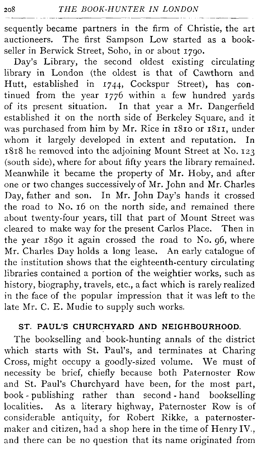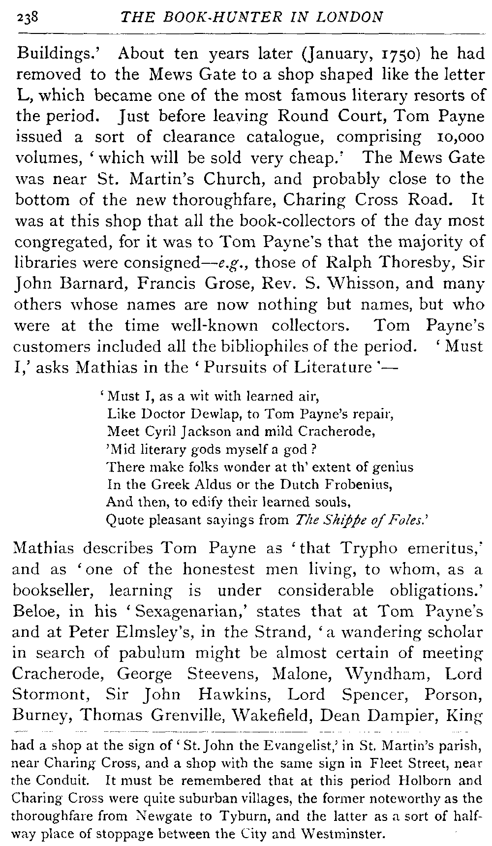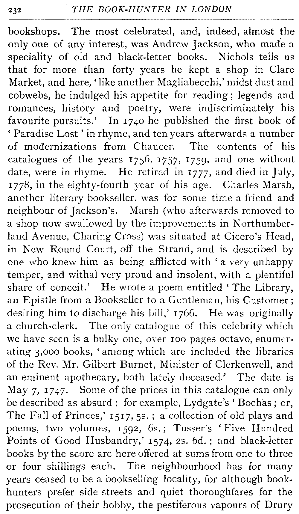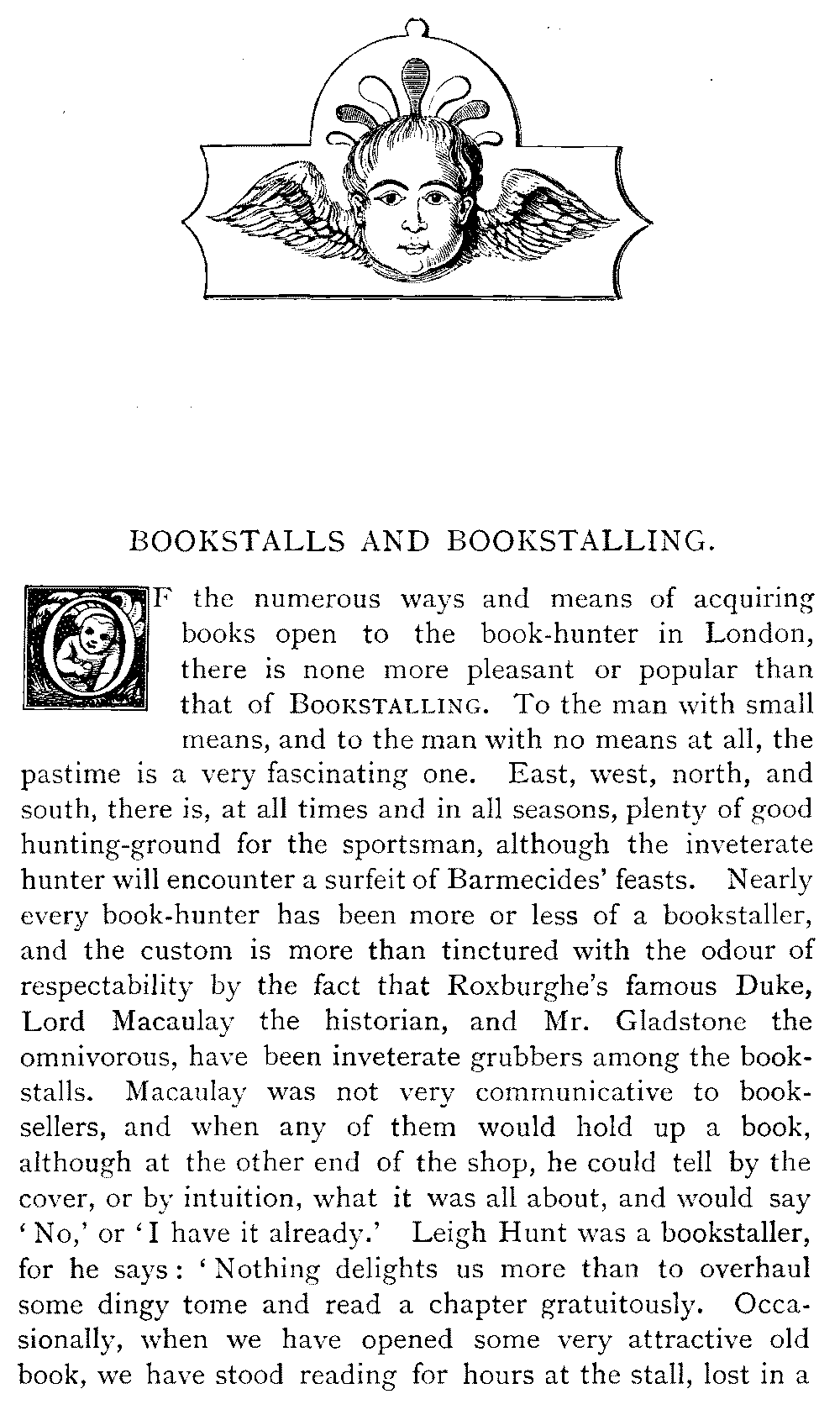 'The Book-hunter in London' is the outcome not only of material which has been accumulating for many years past, from published and unpublished sources, but also of a long and pleasant intercourse with the leading book-collectors and booksellers in London, not to mention a vigorous and constant prosecution of one of the most pleasant and instructive of hobbies. The author has freely availed himself of the information in the works of Dibdin, Nichols, and other writers on the subject, but their statements have been verified whenever possible, and acknowledgements have been made in the proper places to the authorities laid under contribution.