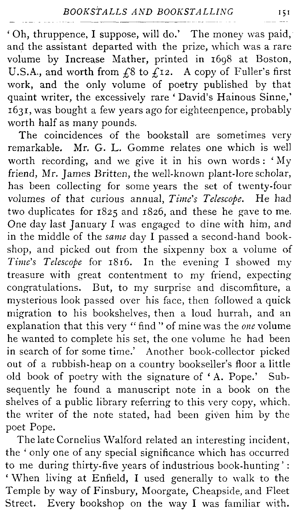 The subject of book-finds is one about which a volume might be written. Every 'special' collector has his fund of book-hunting anecdotes and incidents, for, where the rarity of a well-known [xxv]book is common property, there is not usually much excitement in running it to earth. The fun may be said to begin when two or three people are known to be on the hunt after a rare and little-known volume, whose interest is of a special character. To take, as an illustration, one of the most successful book-hunters of modern times, the late Henry Stevens, of Vermont. Until Mr. Stevens created the taste for Americana among his fellow-countrymen, very few collectors considered the subject worth notice. And yet, in the space of a quarter of a century, he unearthed more excessively rare and unique items than the wildest dreamer could have supposed to exist. Books and pamphlets which were to be had for the proverbial old song when he first came to this country quickly became the objects of the keenest competition in the saleroom, and invariably found buyers at extravagant prices. As an illustration, although not an American item, we may mention that when a copy of the Mazarin Bible was offered at Sotheby's in 1847, the competitors were an agent of Mr. James Lenox (Stevens' client) and Sir Thomas Phillipps in person; the latter went to £495, but the agent went £5 better, and secured the prize at the then unheard-of price of £500. At first Mr. Lenox declined to take the book, but eventually altered his mind, wisely as it proved, for although at long intervals copies are being unearthed, the present value of Mr. Lenox's copy cannot be much short of £4,000. During 1854 and 1855 Mr. Stevens bought books to the value of over 50,000 dollars for Mr. Lenox, and on reviewing the invoices of these two years, 'I am confident,' says Mr. Stevens, 'that, if the same works were now' (1887) 'to be collected, they would cost more than 250,000 dollars. But can so much and so many rare books ever be collected again in that space of time?' In December, 1855, Mr. Stevens offered Mr. Lenox in one lump about forty Shakespeare quartos, all in good condition, and some of them very fine, for £500, or, including a fair set of the four folios, £600, an offer which was accepted, and it may be doubted whether such a set could now be purchased for £6,000. Mr. Lenox was for over ten years desirous of obtaining a perfect copy of 'The Bay Psalter,' printed by Stephen Daye at Cambridge, New England, 1640, the first book printed in what is now the United States, and had given Mr. Stevens a commission of £100 for it. After searching far and wide, the long-lost 'Benjamin' was discovered in a lot [xxvi]at the sale of Pickering's stock at Sotheby's in 1855. 'A cold-blooded coolness seized me, and advancing towards the table behind Mr. Lilly, I quietly bid, in a perfectly neutral tone, "Sixpence"; and so the bids went on, increasing by sixpences, until half a crown was reached and Mr. Lilly had loosened the string. Taking up this very volume, he turned to me and remarked, "This looks a rare edition, Mr. Stevens; don't you think so? I do not remember having seen it before," and raised the bid to 5s. I replied that I had little doubt of its rarity, though comparatively a late edition of the Psalms, and at the same time gave Mr. Wilkinson a sixpenny nod. Thenceforward a "spirited competition" arose between Mr. Lilly and myself, until finally the lot was knocked down to Stevens for 19s.' The volume had cost the late Mr. Pickering 3s. It became Mr. Lenox's property for £80. Twenty-three years later another copy was bought by Mr. Cornelius Vanderbilt for 1,200 dollars.