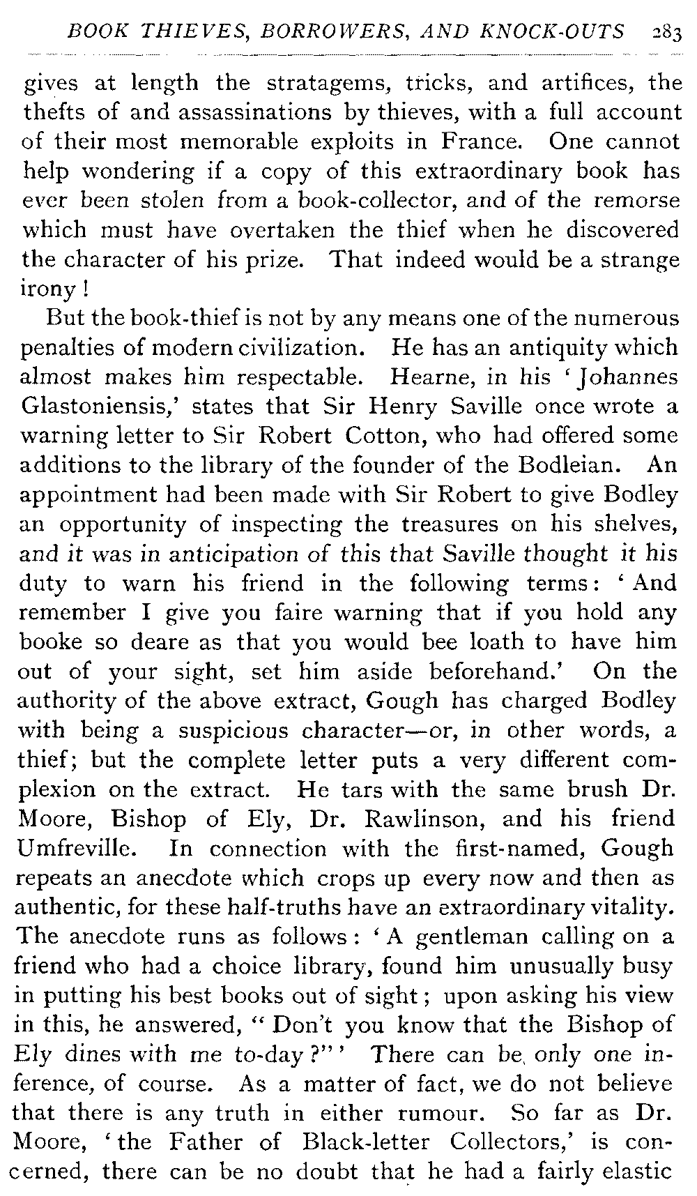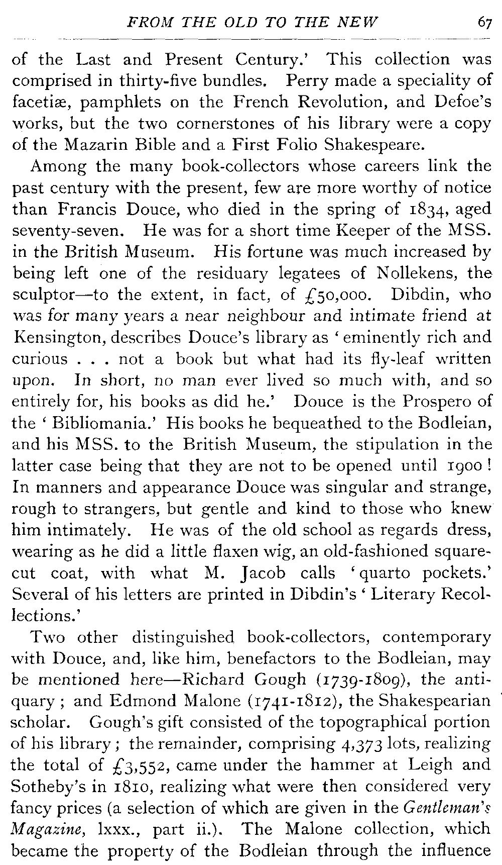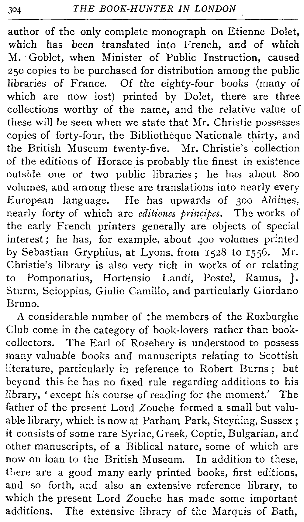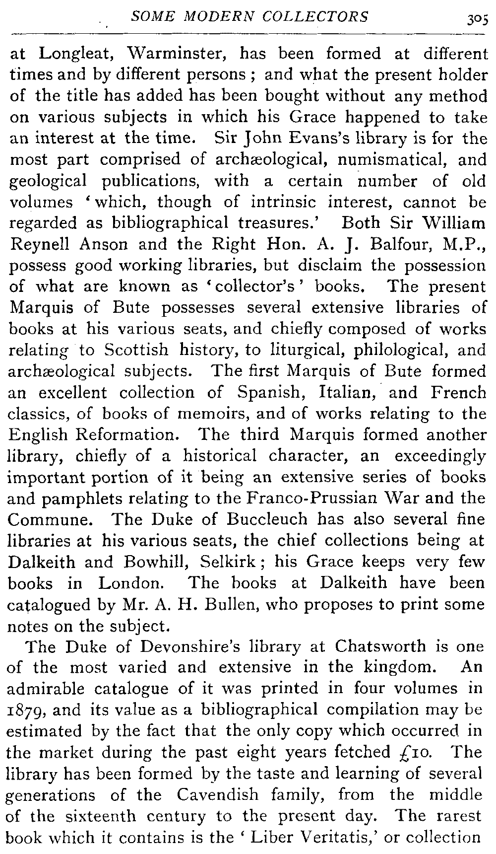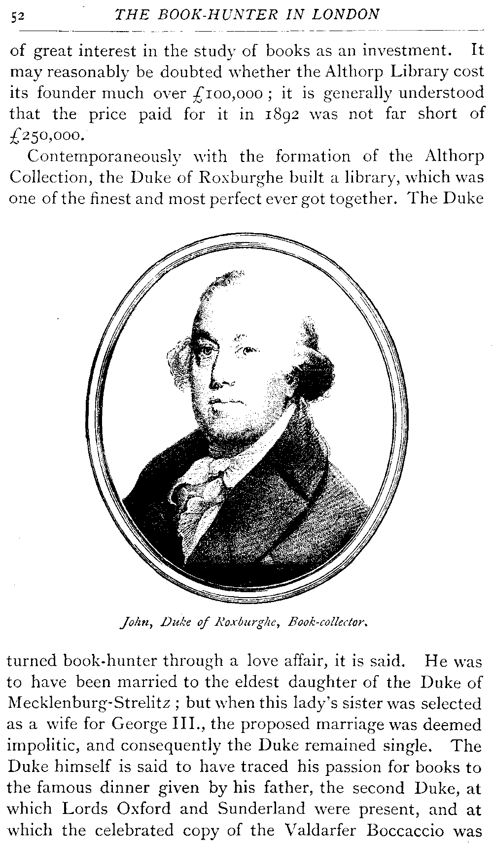 The contempt with which Dr. G. received the bookseller's proposal is peculiarly typical of the book-collector. If he cannot obtain what he wants just exactly when he wants it, he does not care about it. The book-collector is doubtless too prone to despise everything which is not quite in his line, forgetting that all branches of literature contribute in some degree, greater or lesser, to the bulk of human knowledge. No man can be universal, even if he had the wealth of a dozen Rothschilds, or the mental vigour and versatility of a hundred Gladstones.