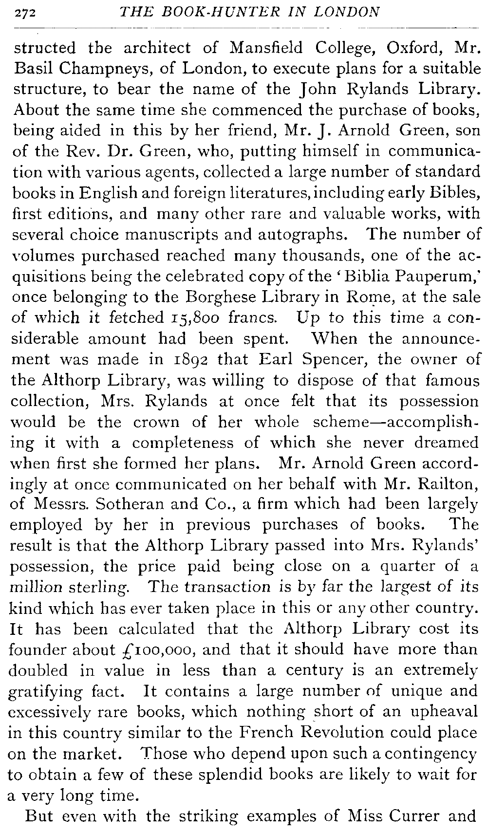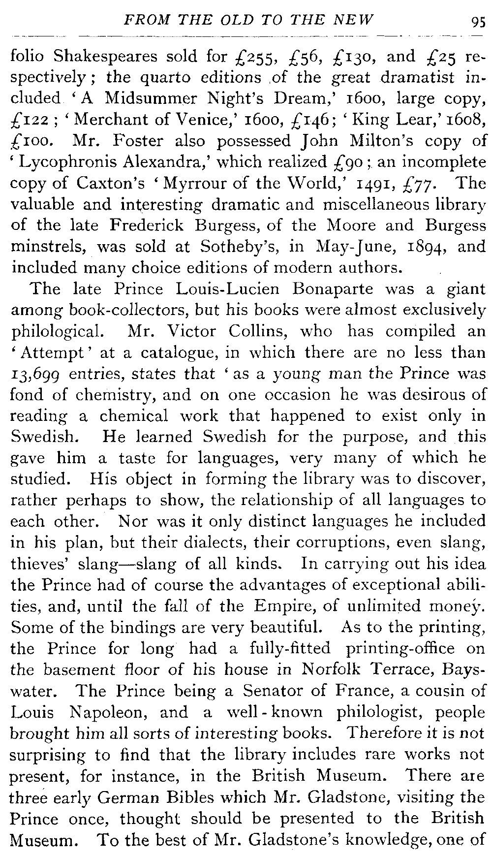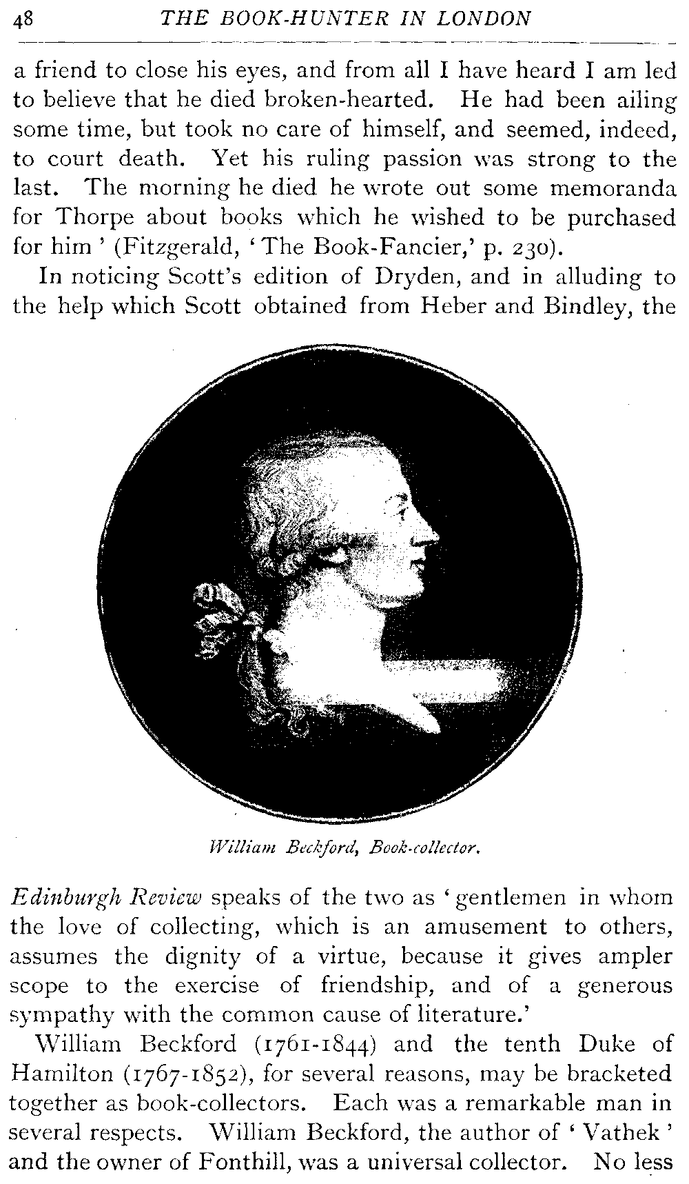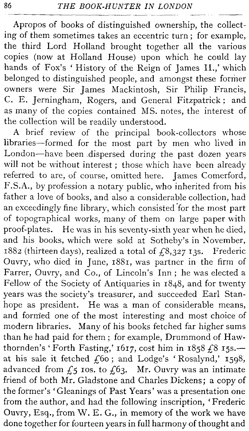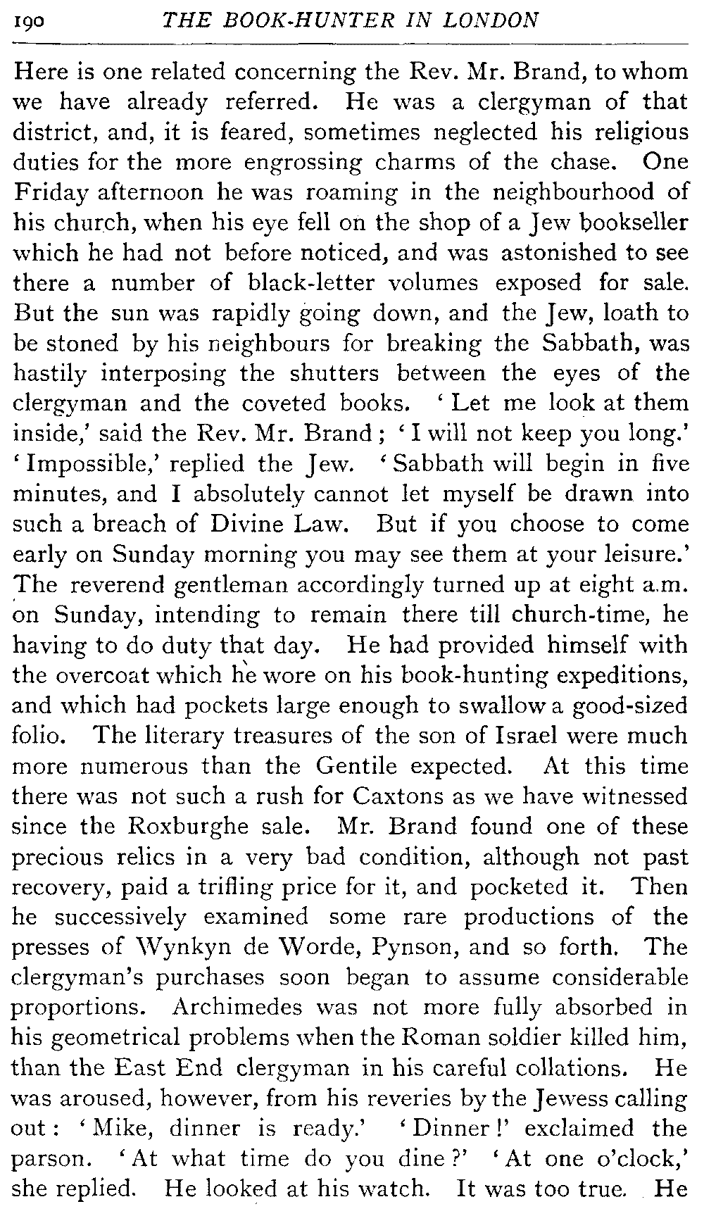 The contempt with which Dr. G. received the bookseller's proposal is peculiarly typical of the book-collector. If he cannot obtain what he wants just exactly when he wants it, he does not care about it. The book-collector is doubtless too prone to despise everything which is not quite in his line, forgetting that all branches of literature contribute in some degree, greater or lesser, to the bulk of human knowledge. No man can be universal, even if he had the wealth of a dozen Rothschilds, or the mental vigour and versatility of a hundred Gladstones.