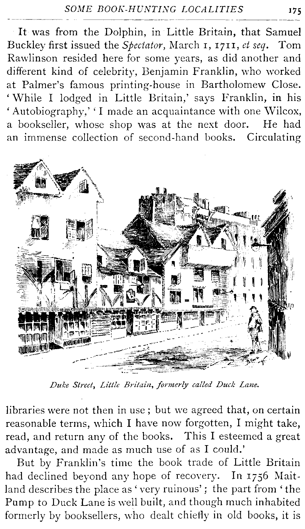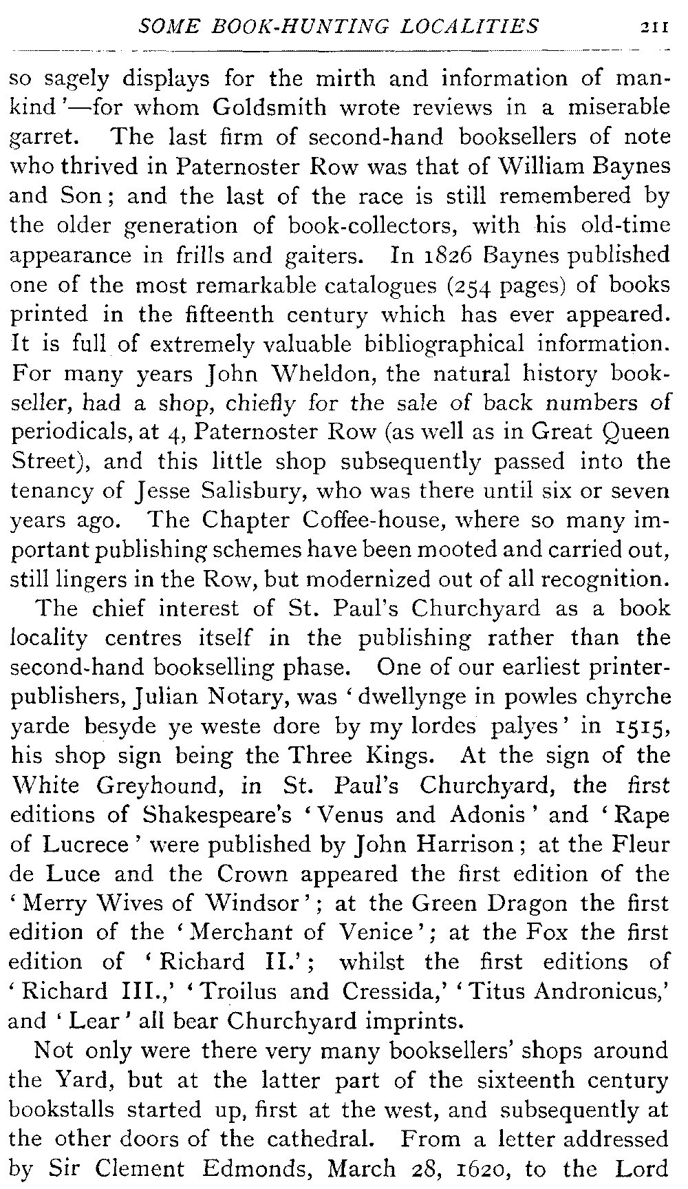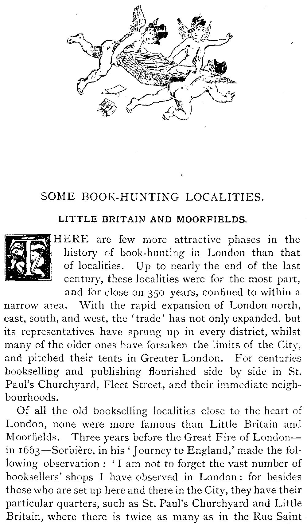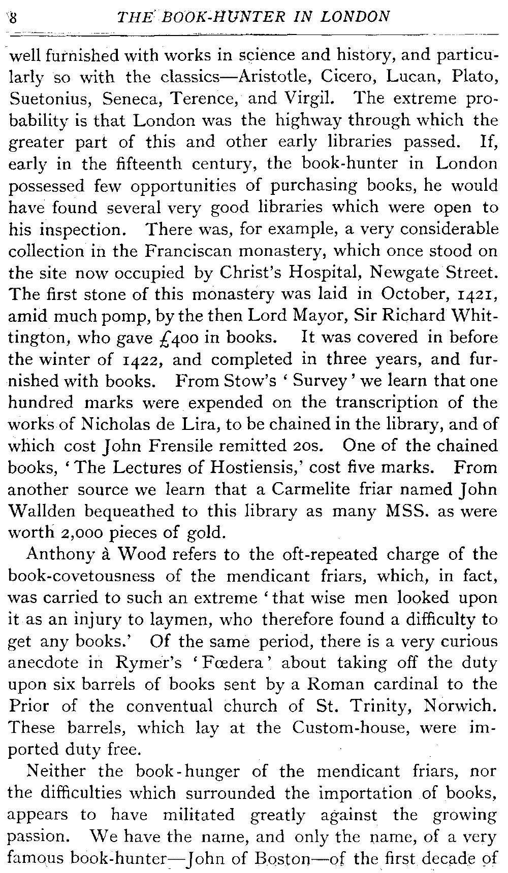 THOSE who have studied the earlier phases of English history will readily understand that the terms book-hunting in England and book-hunting in London are by no means synonymous. The passion for books had manifested itself in various and remote parts of this country long before London had developed into a place of importance; when, indeed, it was battling from without and within with conflicts which seemed to predict complete annihilation. But the growth of London is essentially typical of the growth of the nation, and of the formation of the national character. When it was laying the foundation of its future greatness London had no thought of intellectual pursuits, even if Londoners themselves had any conception of an intellectual life. For any trace of such unthought-of, and perhaps, indeed, unheard-of, articles as books, we must go to localities far remote from London—to spots where, happily, the strife [2]and din of savage warfare scarcely made themselves heard. The monasteries were the sole repositories of literature; to the monk alone had the written book any kind of intelligence, any species of pleasure. To him it was as essential as the implements of destruction to the warrior, or the plough to the husbandman. The one had no sympathy, no connection, with the other, only in so far that the events which transpired in the battlefield had to be recorded in the scriptorium. Although London was a place of importance at a very early stage of the Roman occupation, it was not in any sense an intellectual centre for centuries after that period.